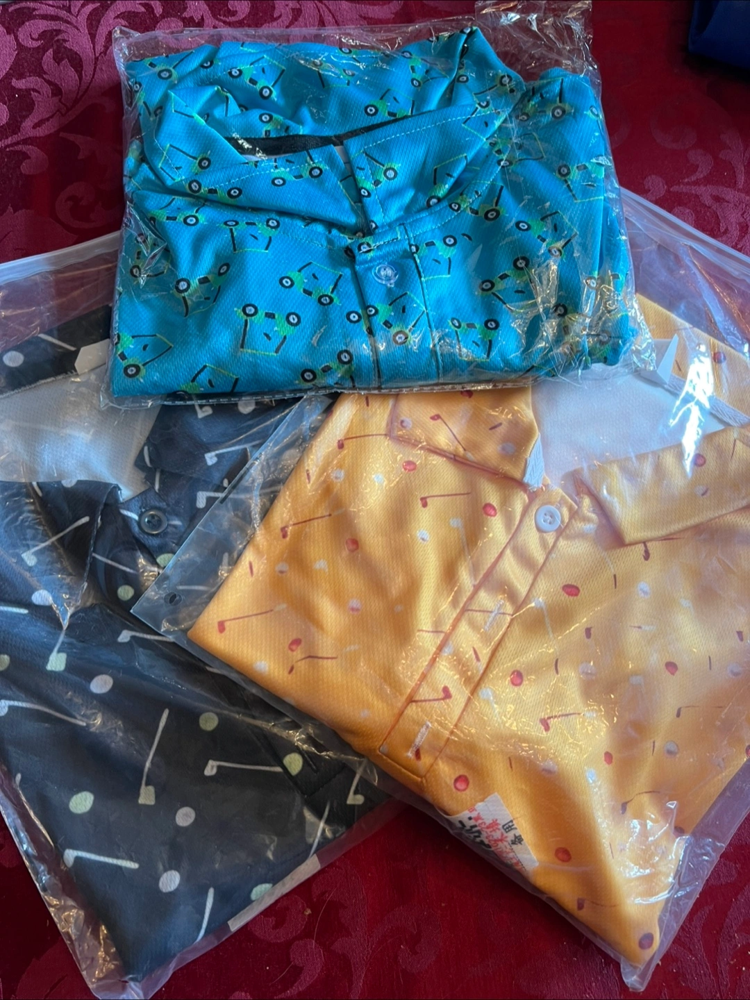 I have these golf polo shirts available. They are in their original packaging. There is one blue shirt with a golf cart pattern, a black shirt with a golf club pattern, and a yellow shirt with a golf club and ball pattern, all XL $15.00 each or all 3 for $40.00