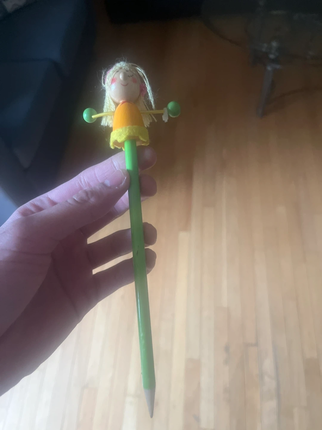 This is a fun pencil with a wooden doll topper. The doll has blonde hair and a yellow shirt. It's a great way to add some personality to your writing tools!