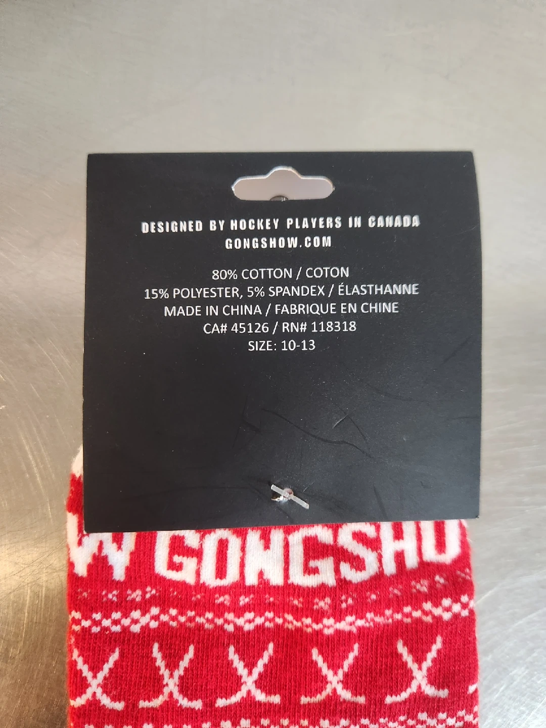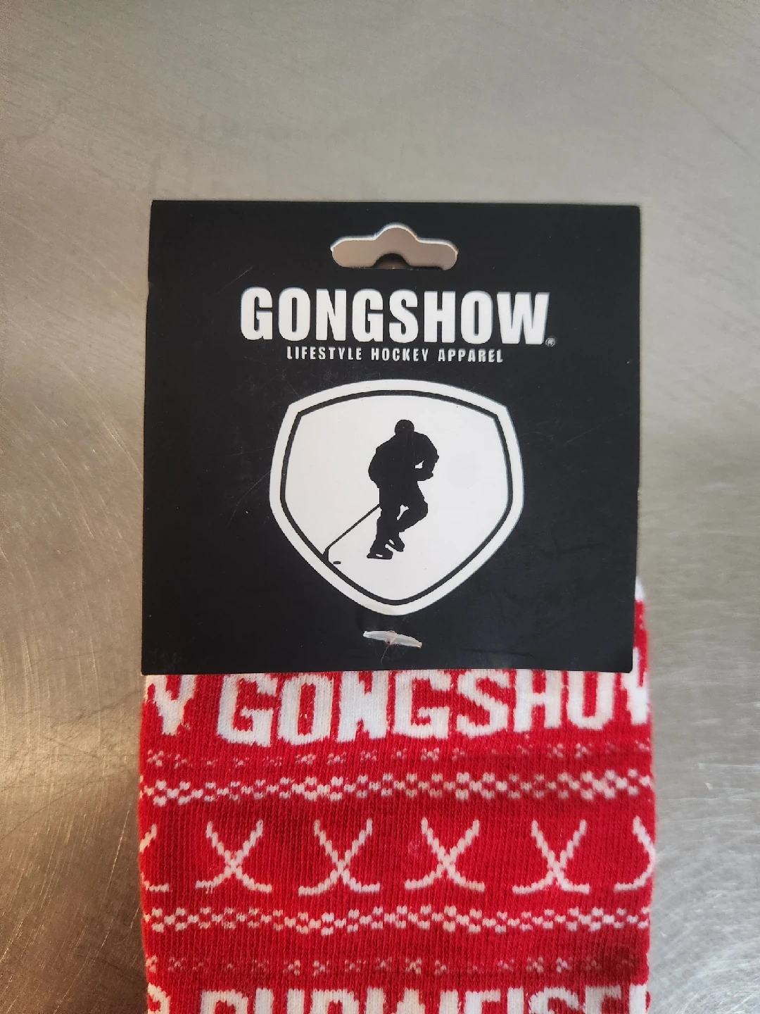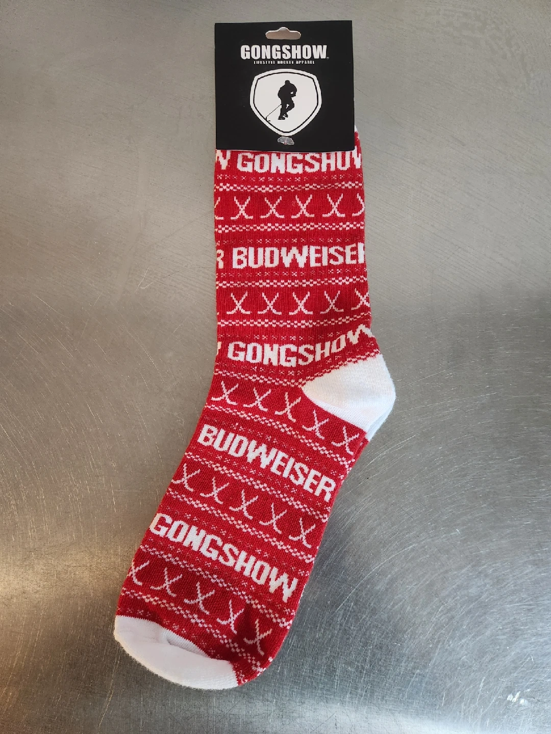 132These Gongshow lifestyle hockey apparel socks are perfect for any hockey fan! They feature a fun red and white pattern with the Budweiser logo. - Size: 10-13 - Material: 80% Cotton, 15% Polyester, 5% Spandex