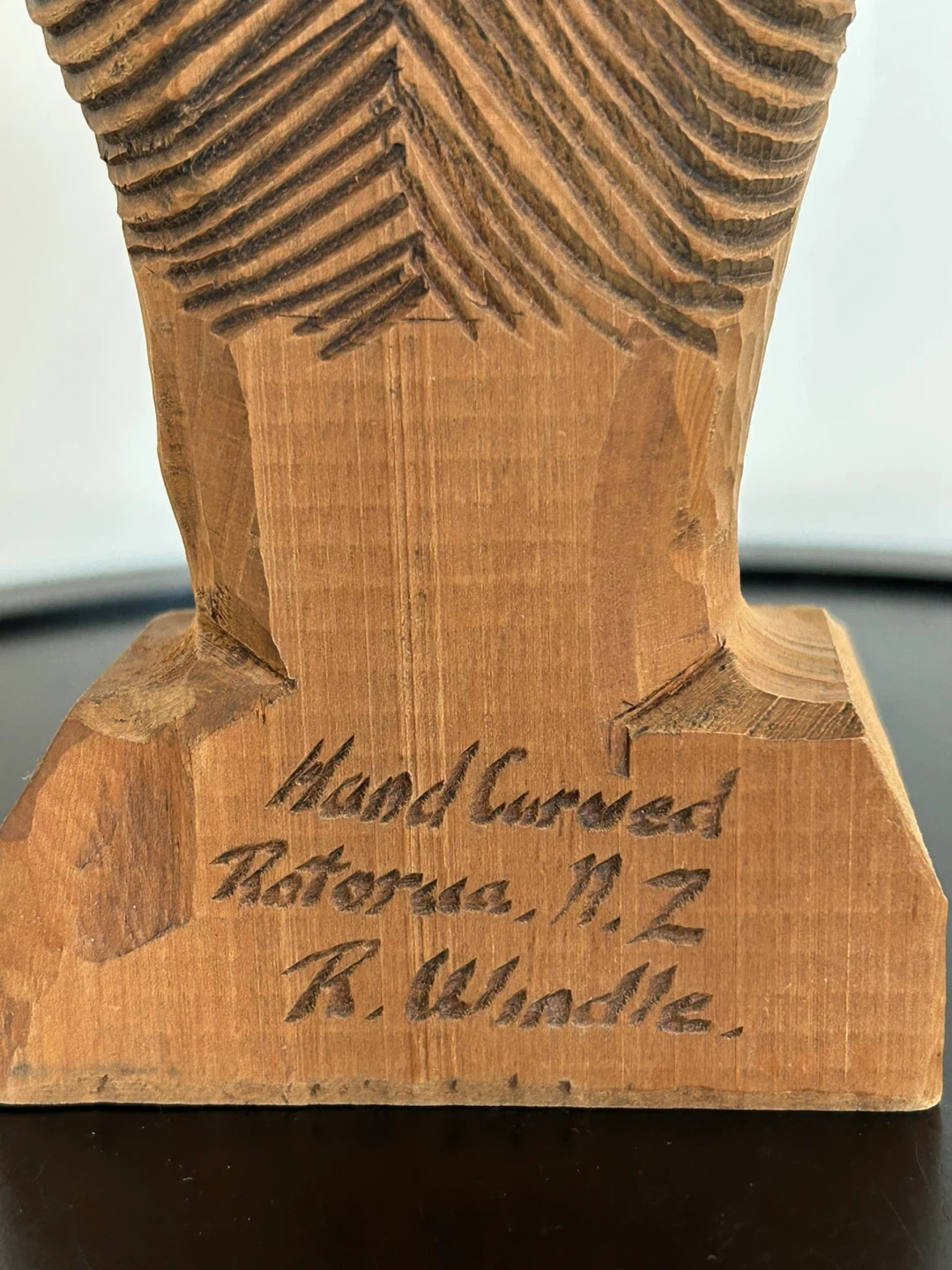 Beautifully detailed vintage Māori hand-carved wooden bust, signed “R. Windle” on the base and crafted in Rotorua, New Zealand – a world-renowned center of Māori carving and cultural artistry.