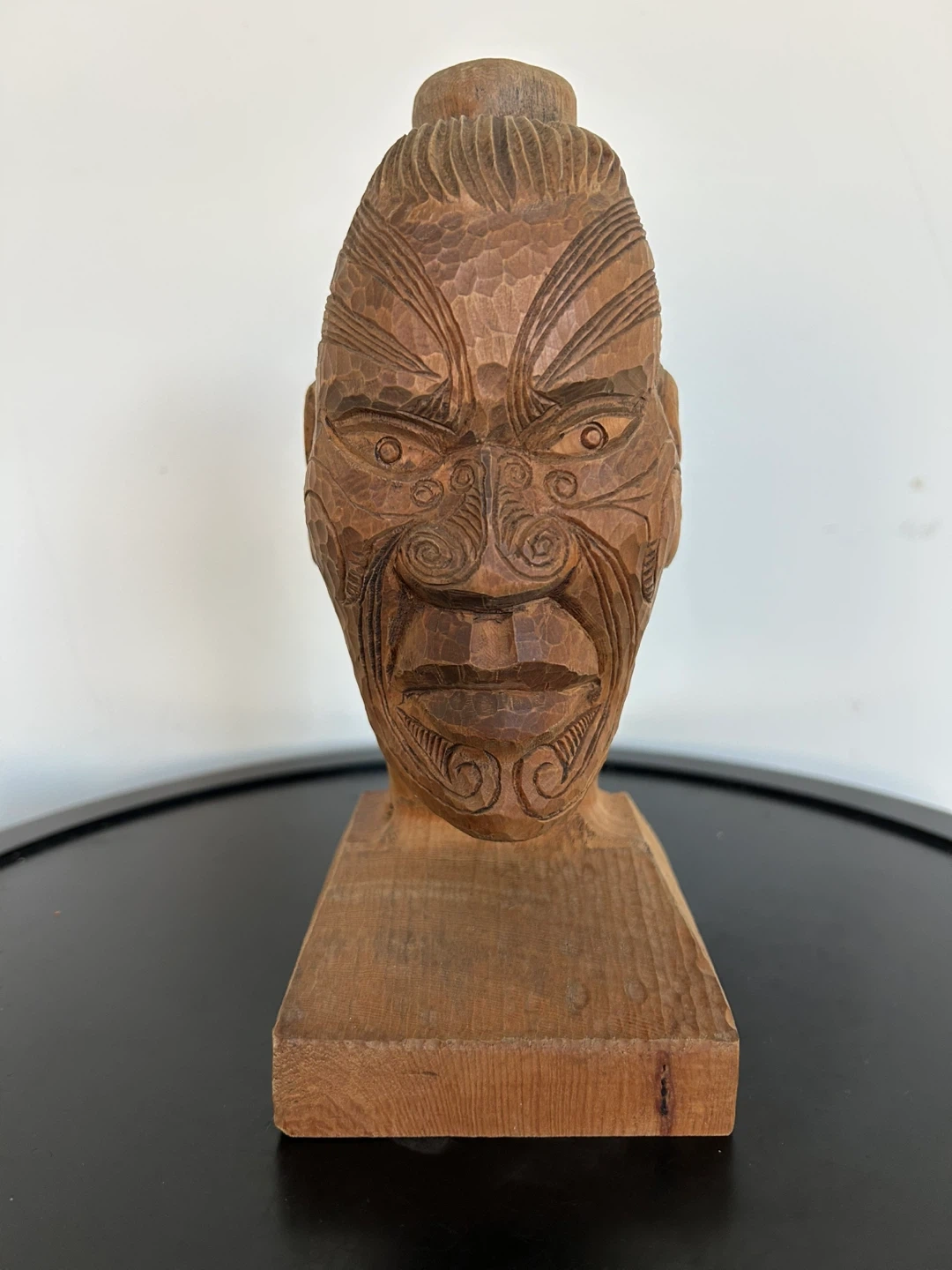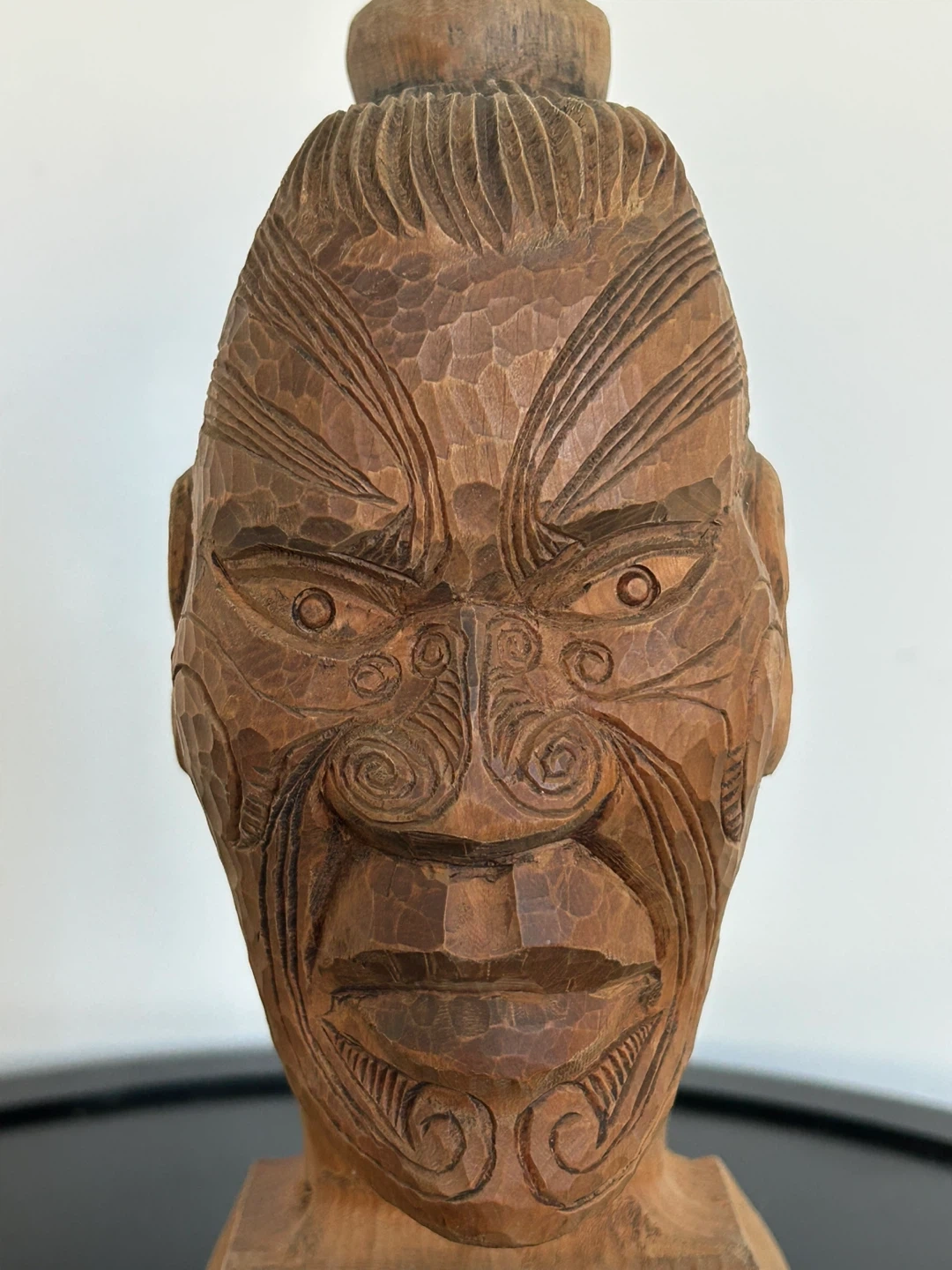 This expressive carving features intricate tā moko (traditional facial tattoo) patterns and a classic top-knot hairstyle, capturing the strength and mana of a Māori warrior figure. The facial detailing and flowing carved lines reflect the traditional whakairo (carving) style associated with the Rotorua region.