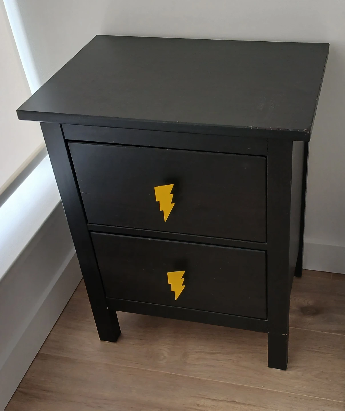 754good condition nightstand. I customized the knobs with yellow lightning knobs but can also return it to the normal knobs as in the second picture for your reference. the top right has some minor scratches but no structure issues. 54x38x66 cm Height.