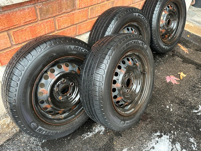 A set of 4 good rims that you can use for winter tires, includes a set of bolts and optional covers for a Honda Civic. They come with Michelin Defender All SeasonTires that came from a dealer car purchase, but seem like older tires. 195 = Section Width in Millimeters 65 = Aspect Ration R = Radial Construction 15 = Rim diameter in Inches 91 = Load Index Service Description T = Speed Symbol (T=190 km/h rated) If you don't know your bolt pattern on your current car, you can do a look-up here: https://www.1010tires.com/Tools/Bolt-Pattern-Guide Asking $250 or best reasonable offer.