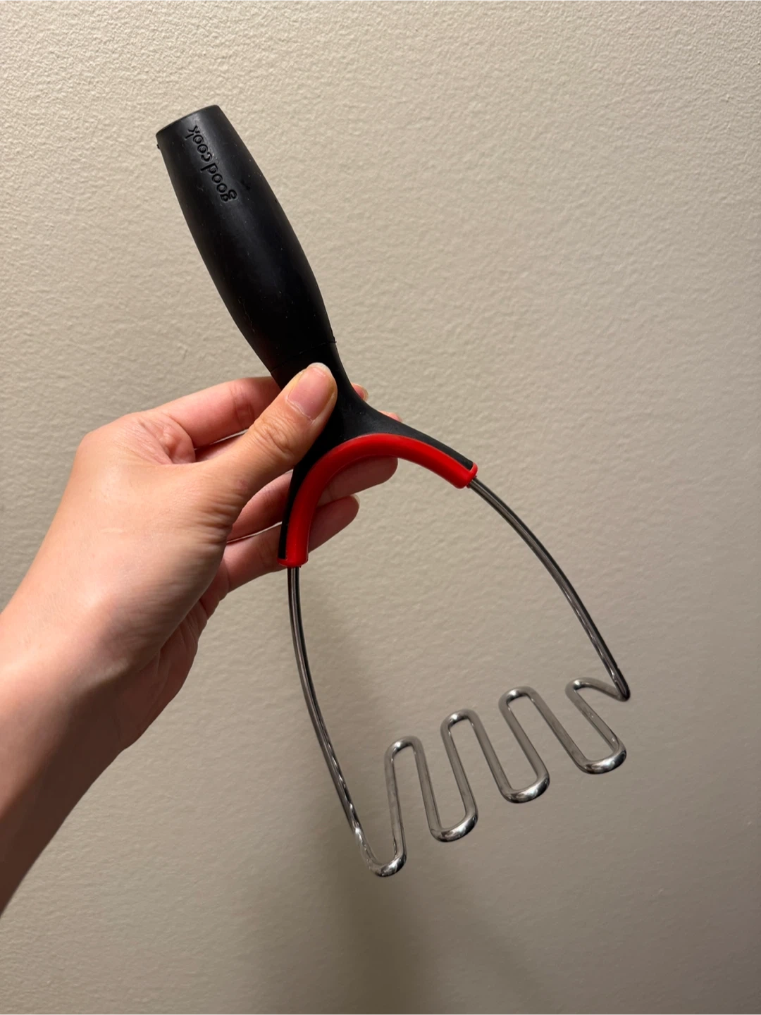 76Selling a Good Cook potato masher! It has a black handle with red accents and a stainless steel mashing end. Perfect for making smooth mashed potatoes!