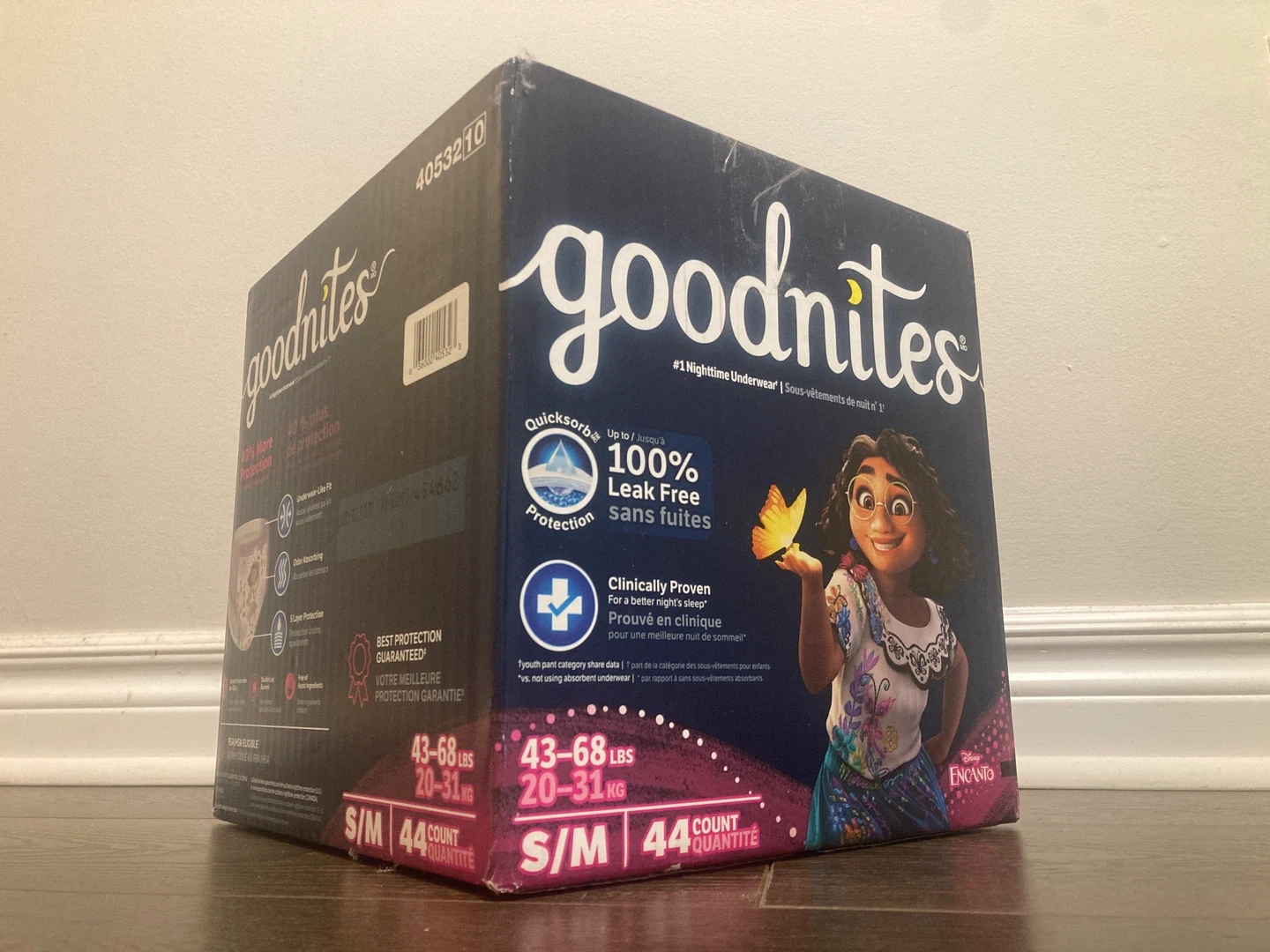65Selling a box of Goodnites in size S/M, suitable for kids weighing 43-68 lbs (20-31 kg). The box contains 44 count. Provides up to 100% leak-free protection with Quicksorb protection. Clinically proven for a better night's sleep!
