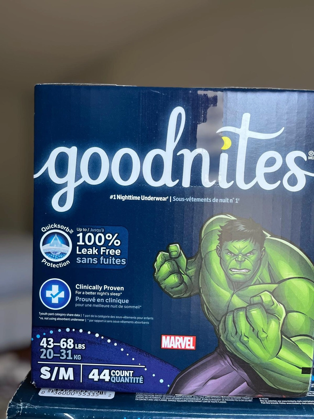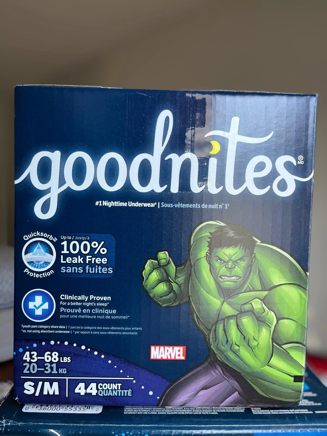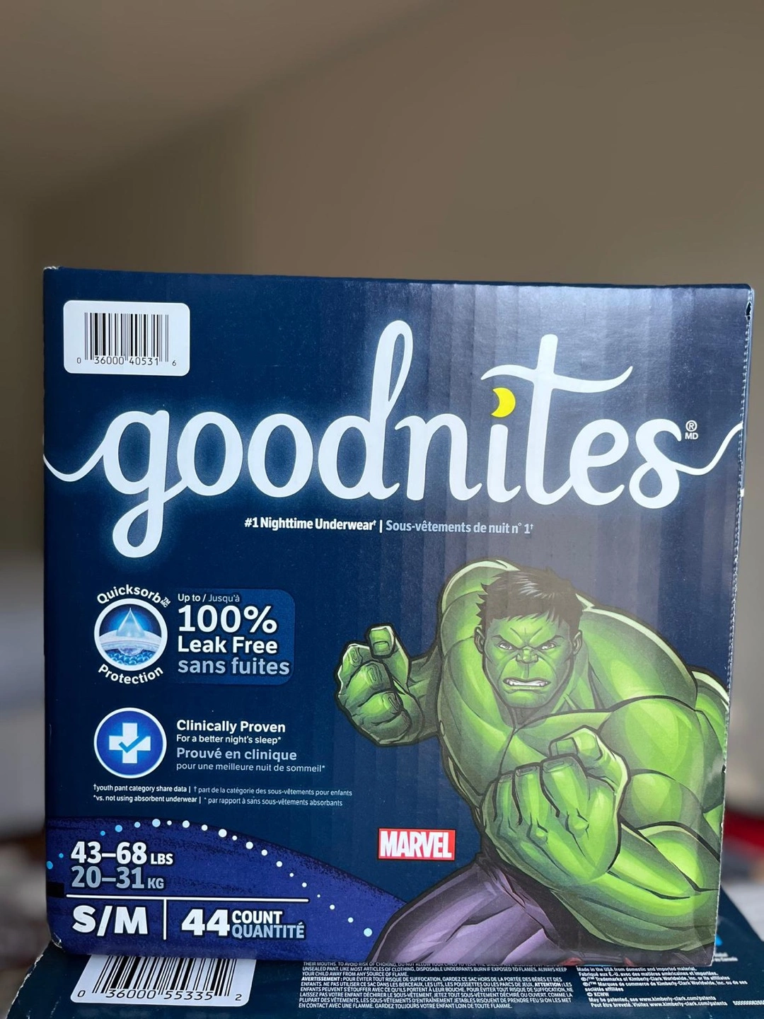 Goodnites nighttime underwear for kids, size S/M (43-68 lbs or 20-31 kg). Features a Hulk design and provides up to 100% leak-free protection. There are 44 in the box
