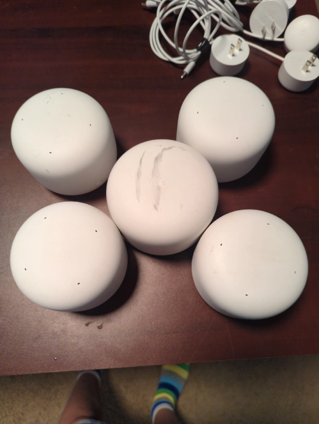 15Selling a set of 5 Google Wifi routers. They're in good condition and come with the power adapters. One of the routers has some visible scratches, but it doesn't affect the performance.