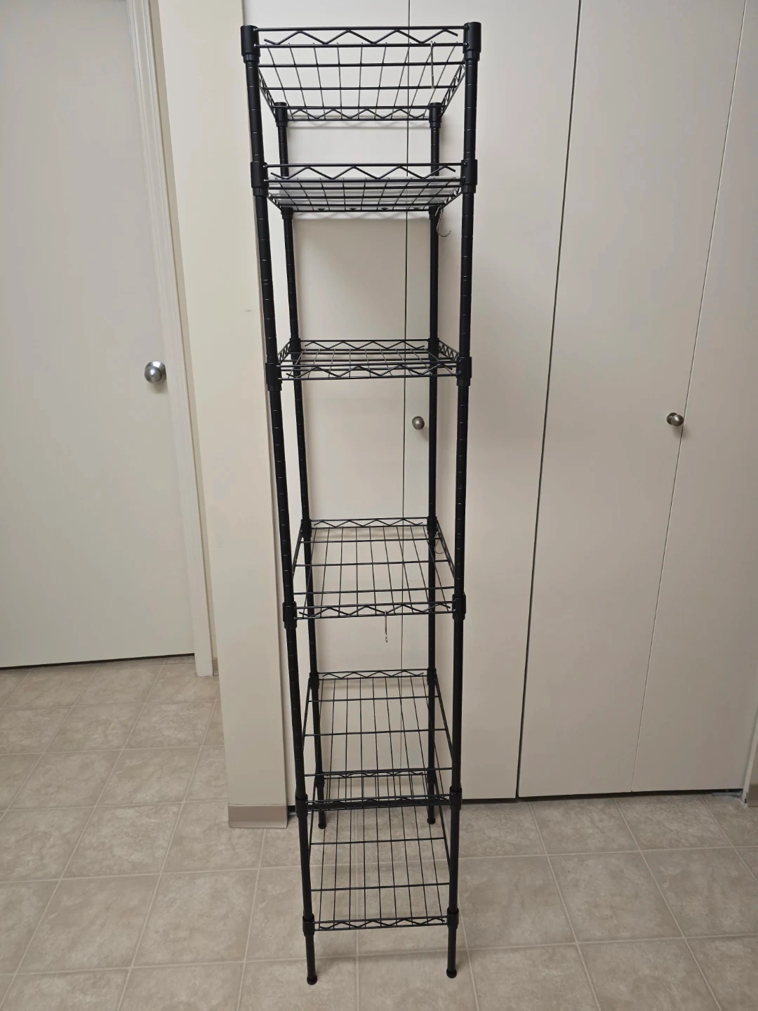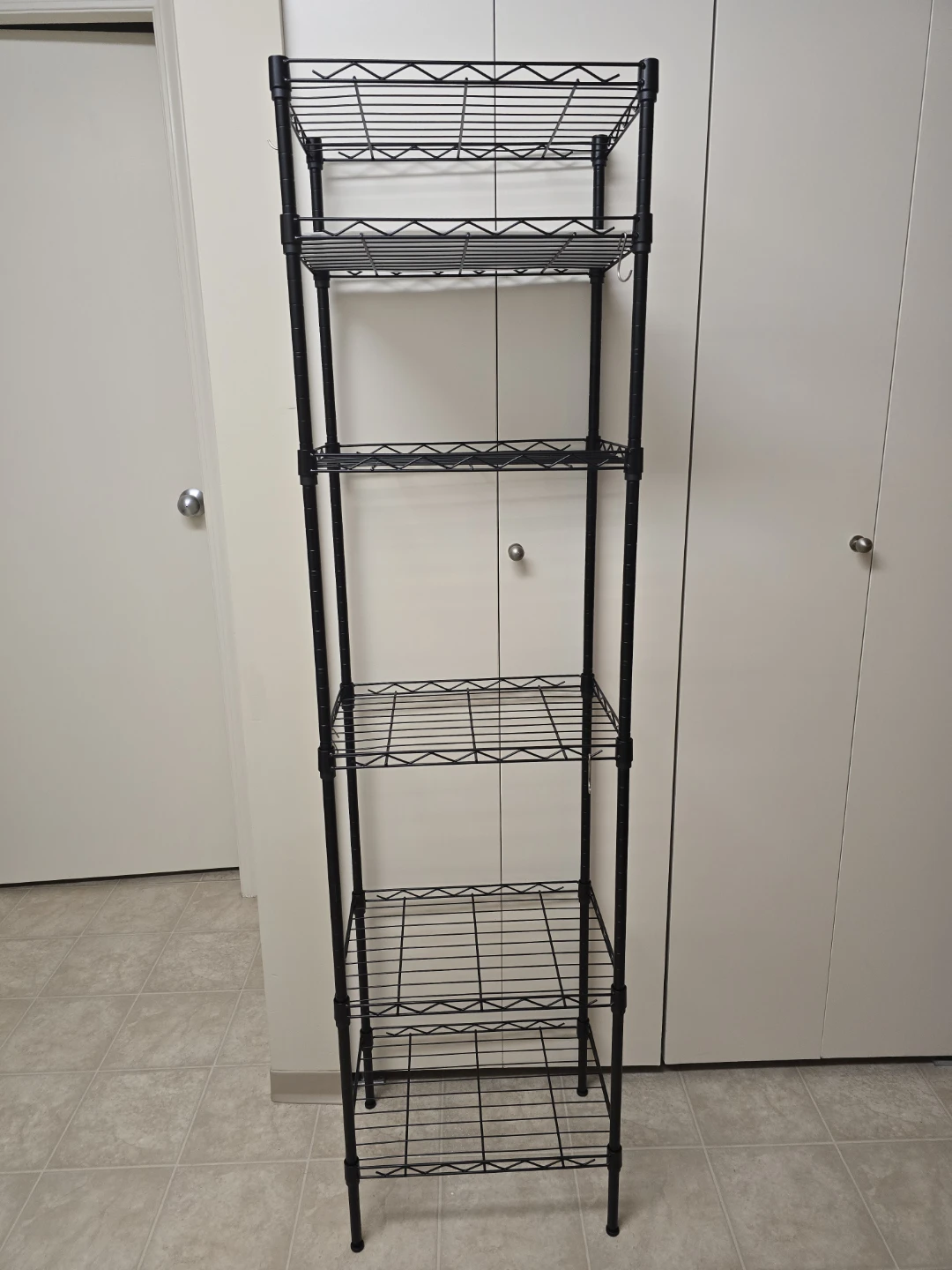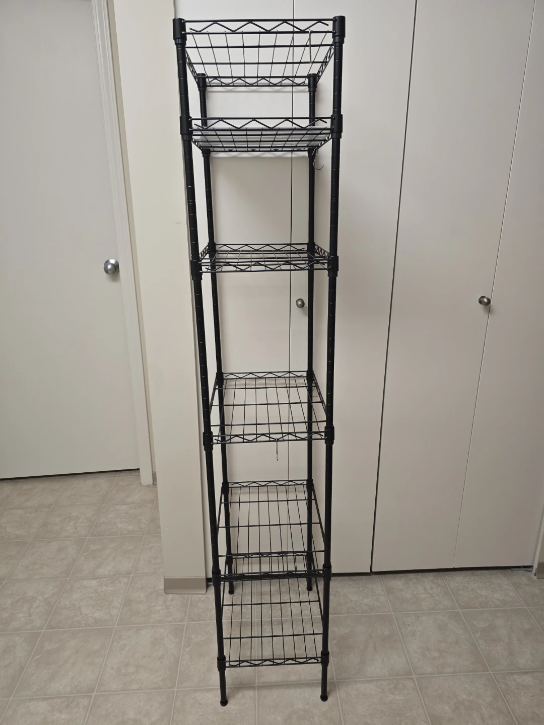 This is a tall, 5-tier wire shelving unit in black. It's a versatile storage solution for garages, pantries, or offices. Wire construction ensures good airflow for stored items.