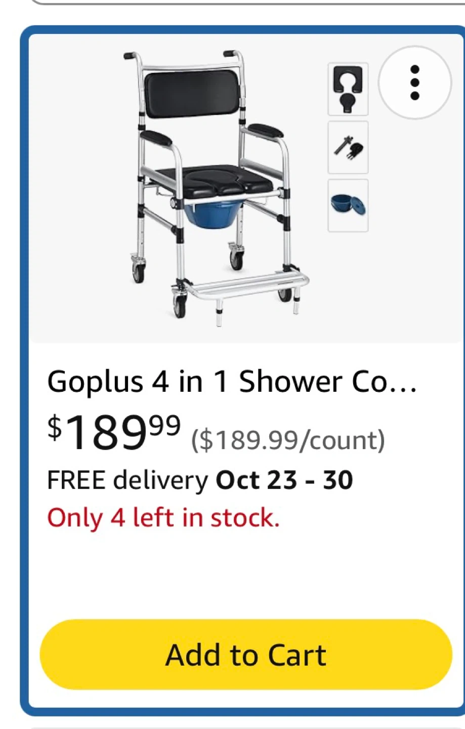 Selling a Goplus 4 in 1 shower commode chair. It looks like it's in great condition! Originally listed for $160.00 I just assembled it to see but never used it