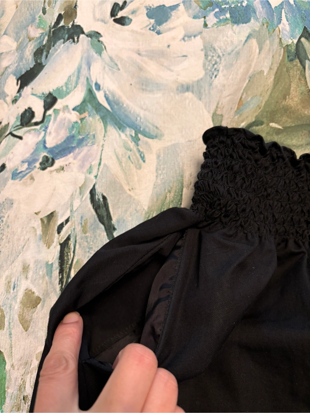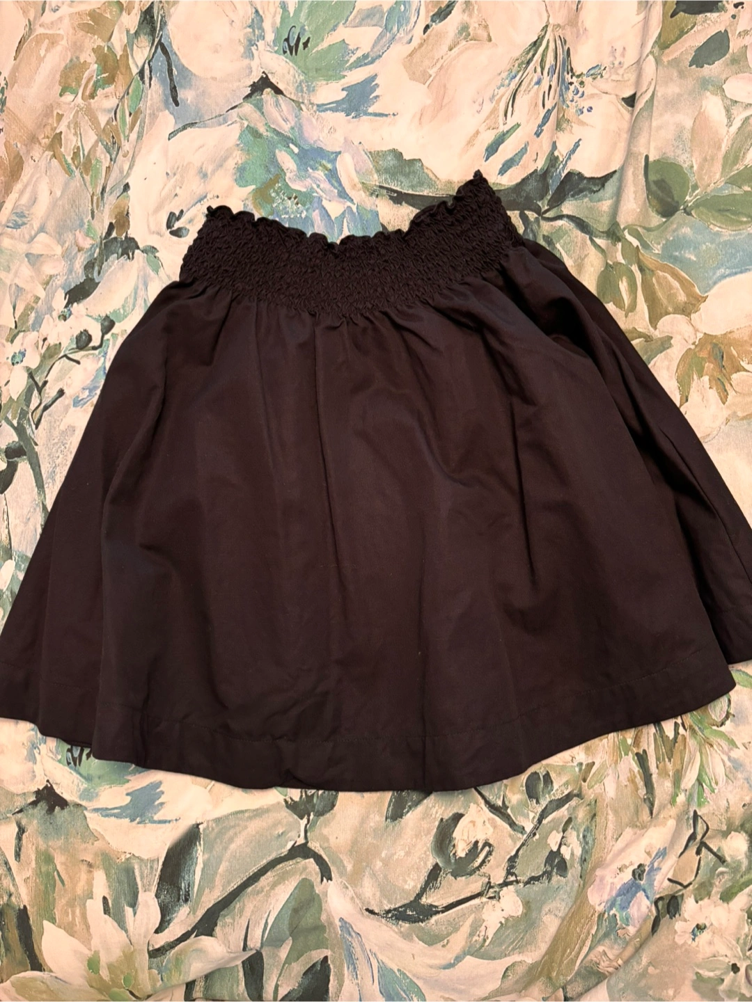 A black skirt with a smocked waist, and pockets. Features a flowing design. Perfect for a relaxing outing.