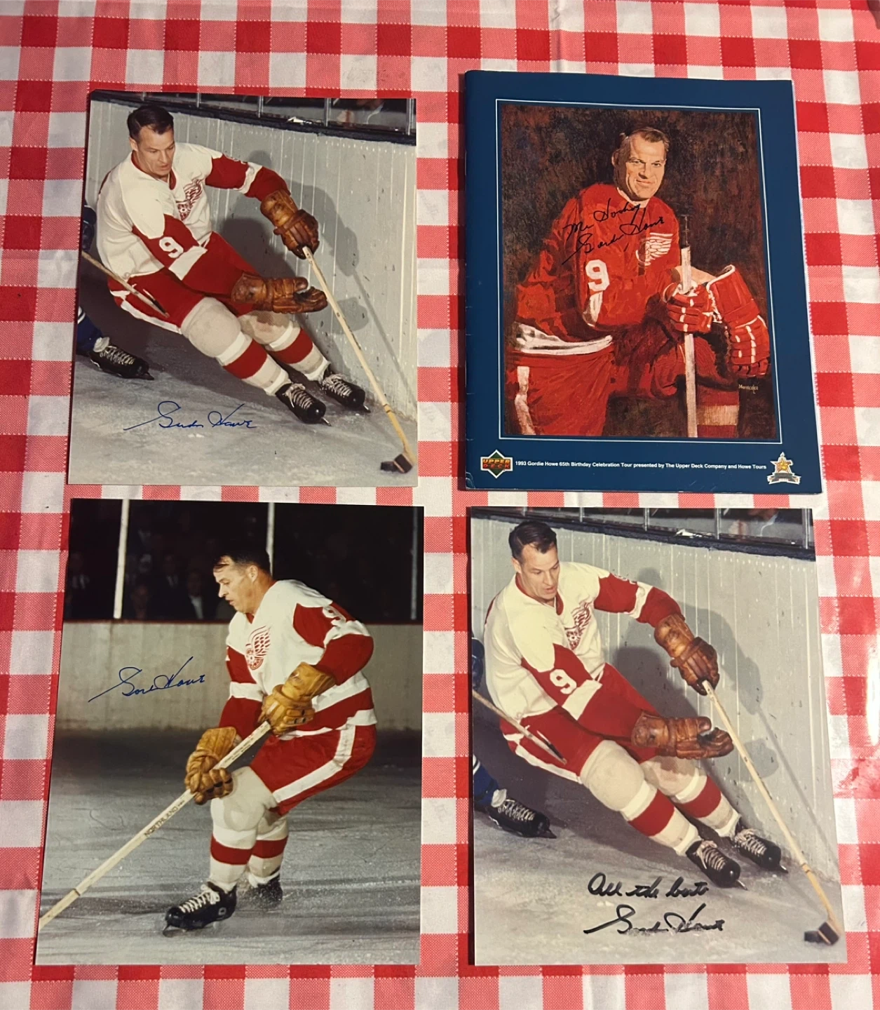 18Selling a collection of Gordie Howe memorabilia! This includes three signed photos of Gordie Howe in action, plus a program from the 1993 Gordie Howe 65th Birthday Celebration Tour presented by the Upper Deck Company and Howe Tours