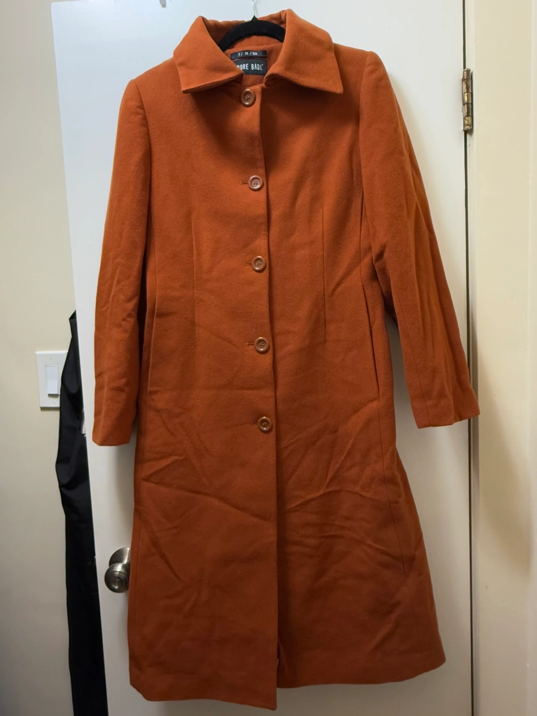 113Beautiful burnt orange coat. Longline length, button front closure. The back details create such a beautiful shape. Classic style, perfect for layering. Excellent condition.