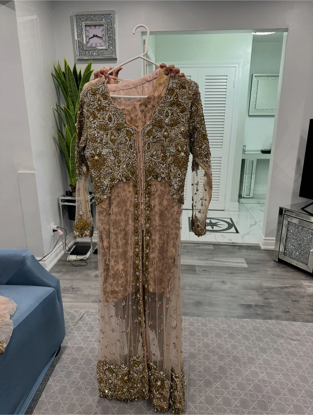 18Beautiful, heavily embellished peach-coloured shalwar kameez. Features intricate gold and silver beading and embroidery. Long sleeves, floor-length. Net fabric. Stunning outfit for special occasions.