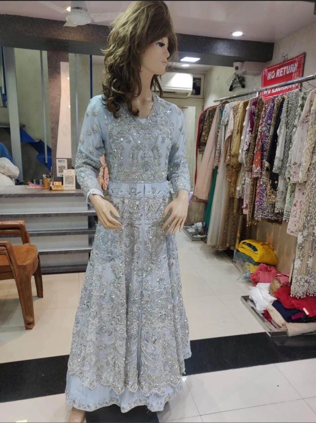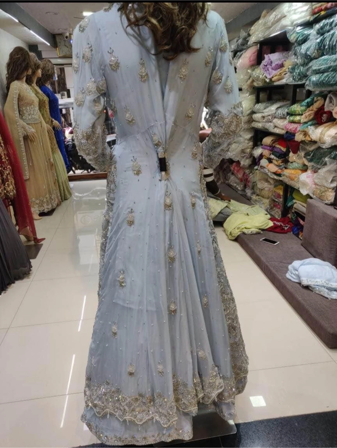 Beautiful light blue maxi dress. Intricate silver embroidery throughout. Long sleeves. Floor-length. Perfect for special occasions. just a few hours where very beautiful included purse.party wear dress