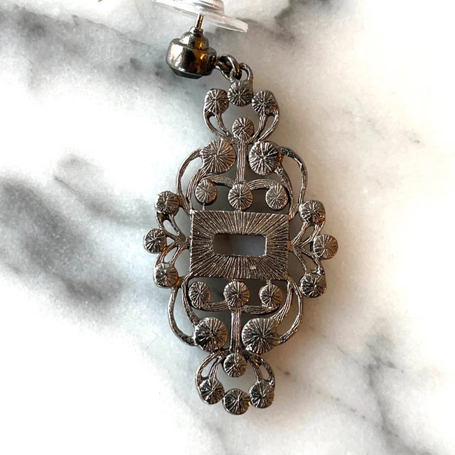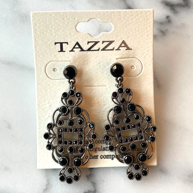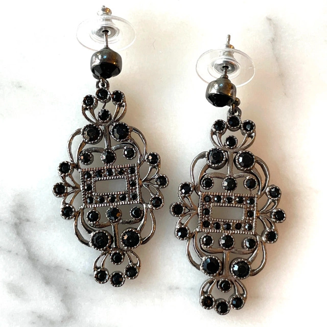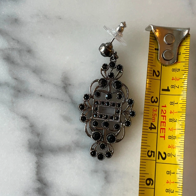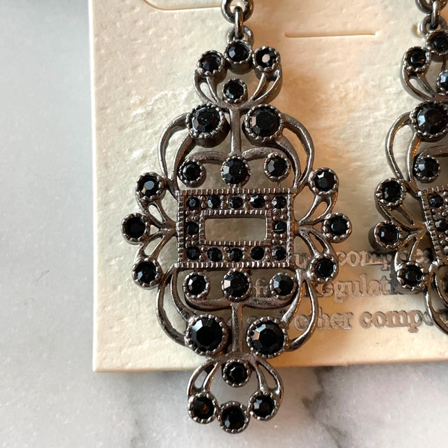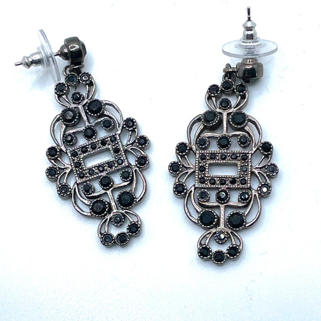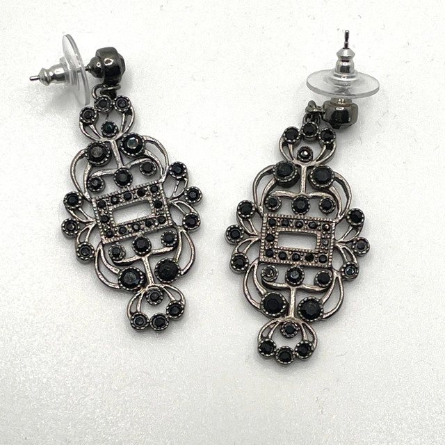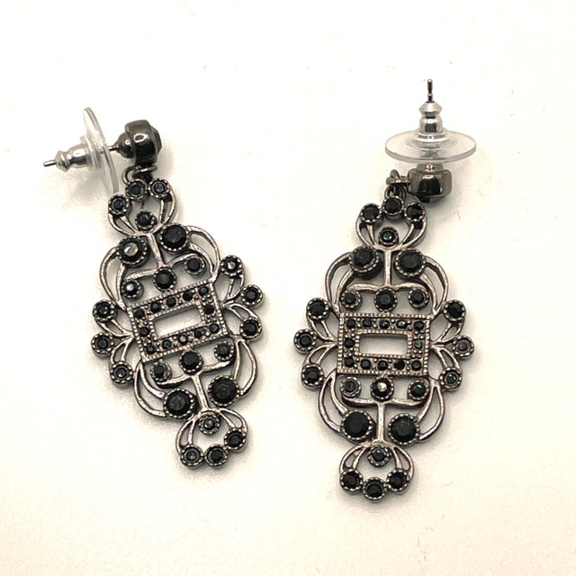 10Selling a pair of gorgeous NEW art deco style pierced earrings. Silver toned metal with black stones. Beautiful design. Hangs 2" down. Comes in gift bag. Asking $20. Available for pick up in the Broadview/Danforth area. Contact-free porch pick up. Check out my other great stuff!