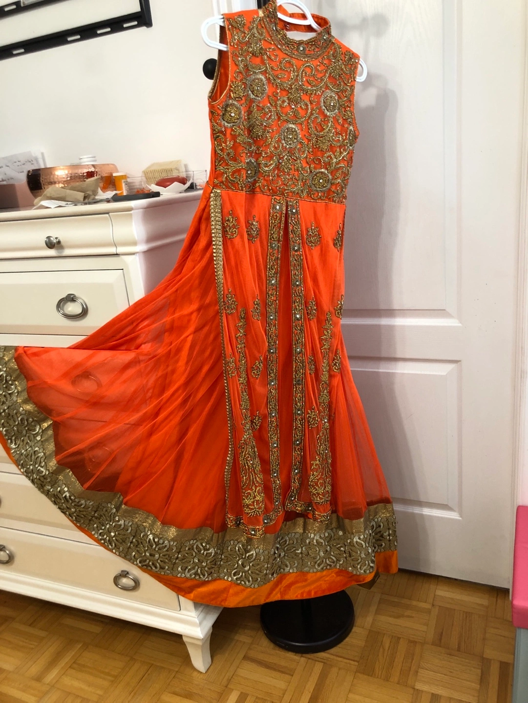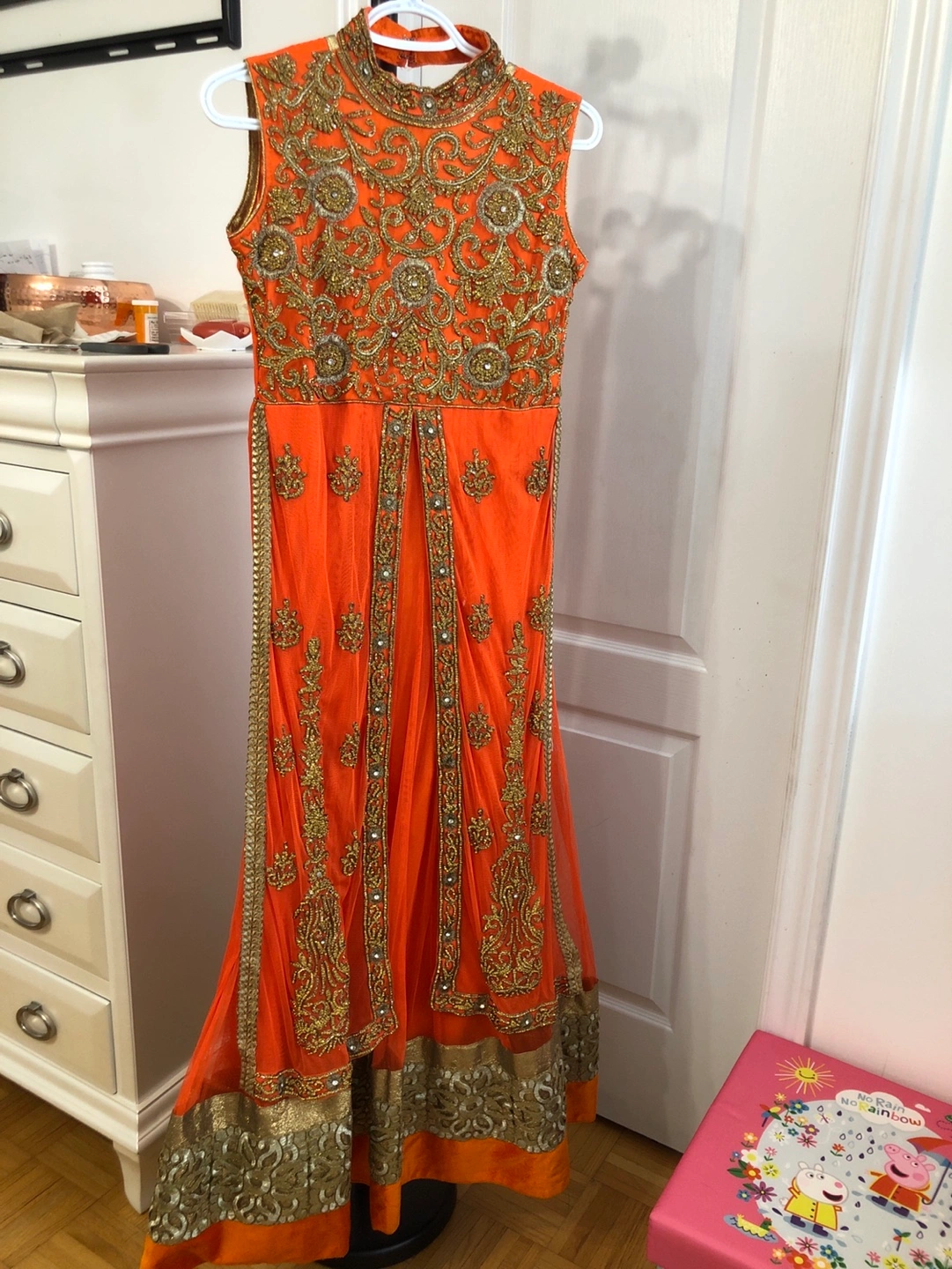 29Beautiful orange floor-length gown. Intricate gold embroidery. Sleeveless with high neck. Front slit. Perfect for weddings and other special occasions. Worn once.