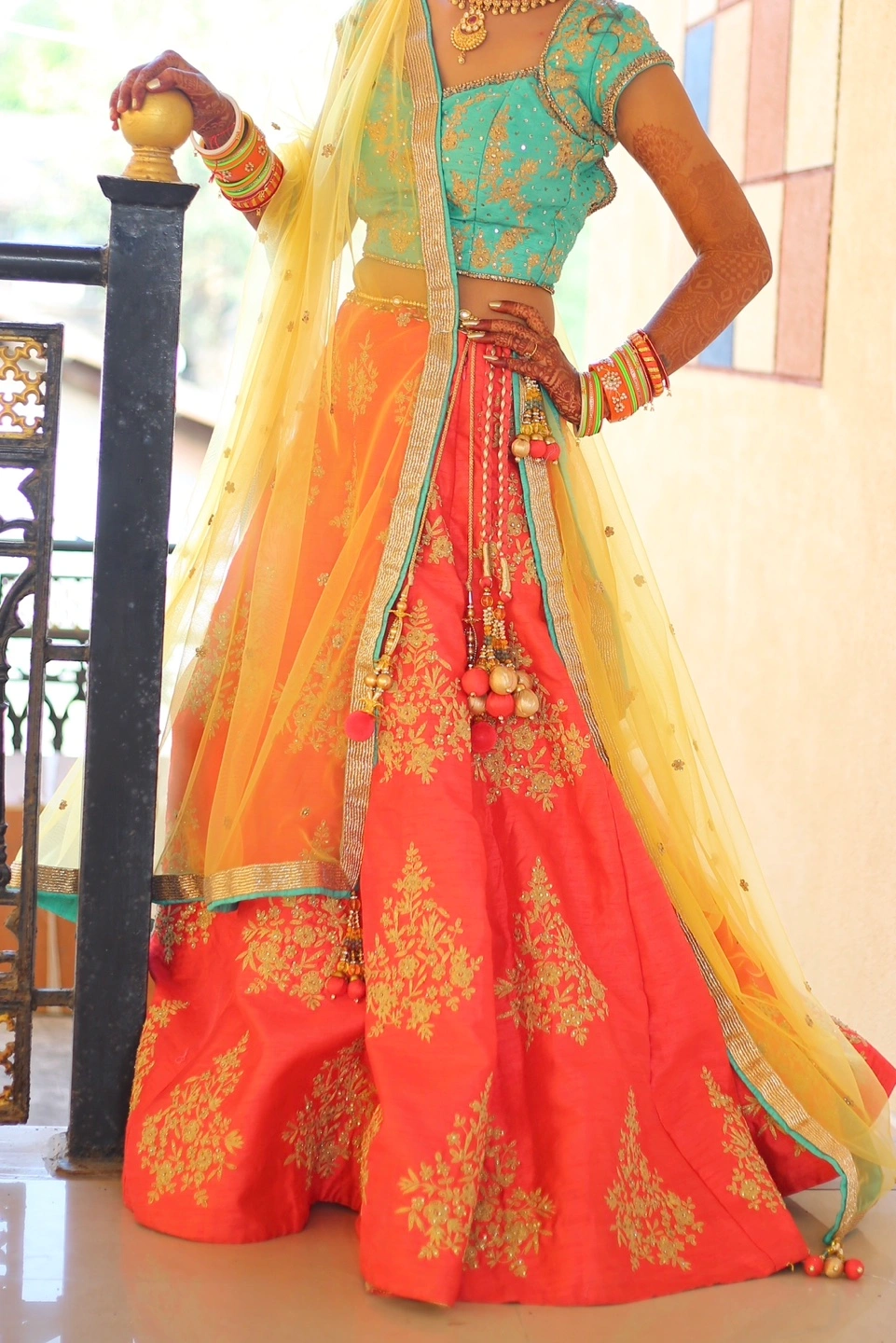 Beautiful bridal lehenga choli. Features a vibrant orange skirt with intricate gold embroidery, a teal choli, and a flowing yellow dupatta. Perfect for a wedding or special occasion.