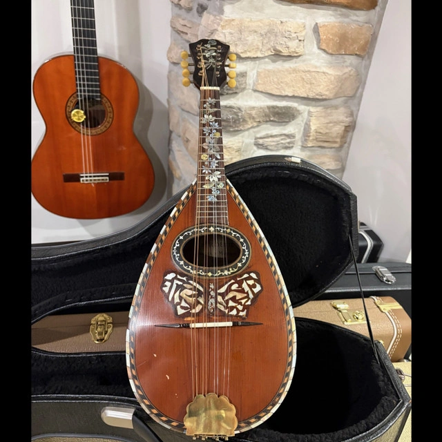 10In incredible shape for an instrument that is well over 100 years old. Bowl back mandolin with huge projection and tone. Ornate abalone work throughout as seen in the photos. Plays great! Among the most renowned and prolific mandolin makers of the early XXᵉ century, the Stridente brand occupies a prominent place. Renowned for its expertise in Neapolitan lutherie, it drew heavily on Vinaccia's aesthetic codes and emblematic style. Very popular in France and England at the time, Stridente mandolins continue to be prized today for their exceptional build quality. This elegant study model, typical of Stridente production around 1900, is distinguished by its fine craftsmanship and the use of carefully selected woods, including spruce, rosewood and maple. In a remarkable state of preservation, this mandolin offers excellent playability and a rich sound, enhanced by a set of Fisoma Supersolo flat purfling strings. In short, an authentic, historic instrument, ready to play, that will appeal to musicians and collectors alike, all at a particularly attractive price! Technical specifications: • Top: Spruce • Back: 17-rib maple • Neck: Rosewood veneered beech • Fingerboard: Rosewood • Nut width: 28 mm • Radius: Flat • Frets: 17 frets • Tuning fork: 330 mm • Profile: Neapolitan • Pickguard: Rosewood • Country of manufacture: Italy • Year: 1900's • Finish: Natural • Decorations: Purfling around the edge of the top and rosette / White mother-of-pearl fingerboard markings • Details: Slight traces of wear, normal given its age / Old repair of 3 traces of woodworm / Excellent condition. Delivered in its original case