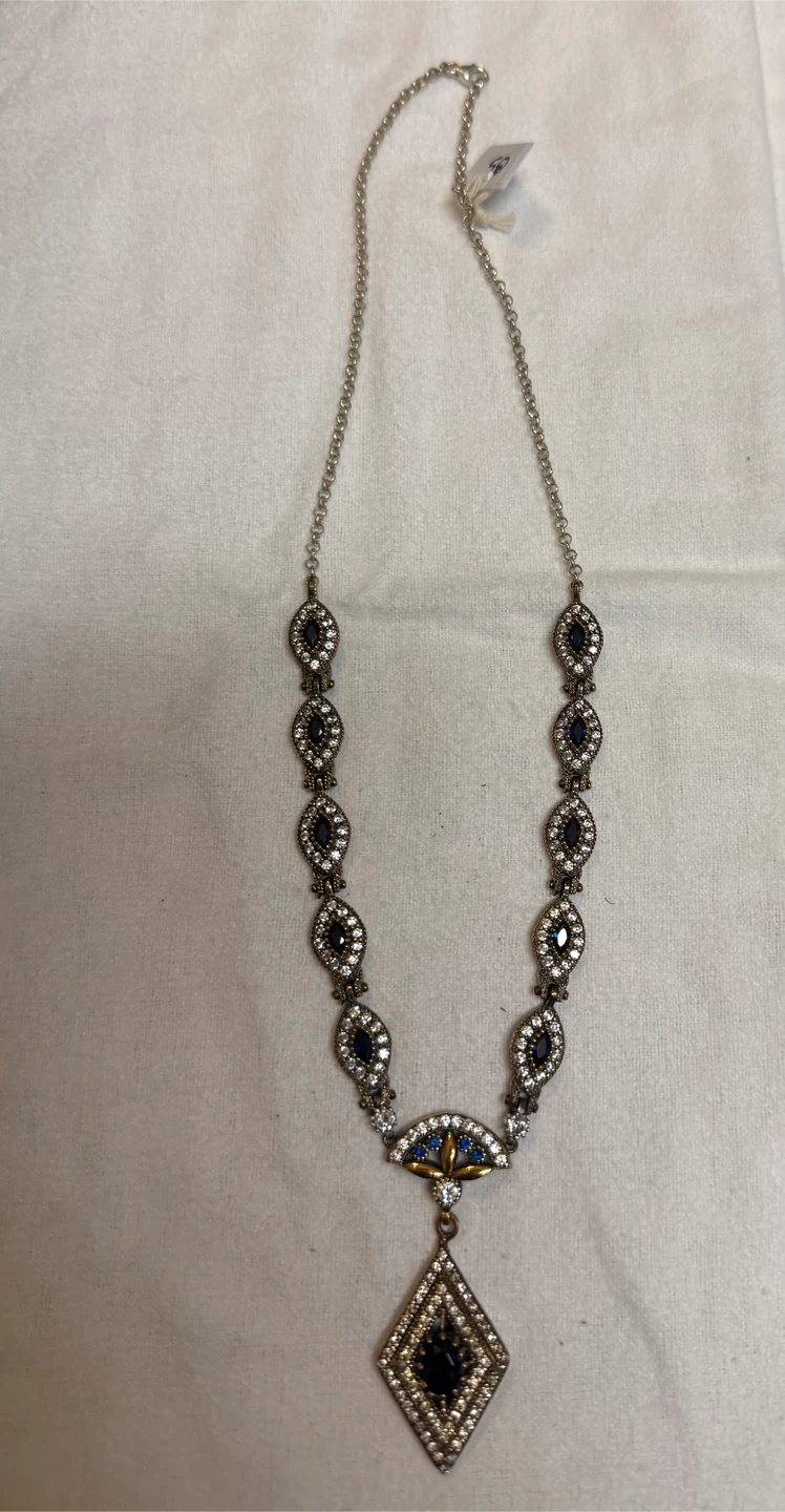 A stunning 18” necklace featuring a 925 sterling silver stamped with copper adorned with oval-shaped blue and clear stones. It has a large diamond-shaped pendant with a dark blue stone at its centre. This piece is perfect for dressing up any outfit!