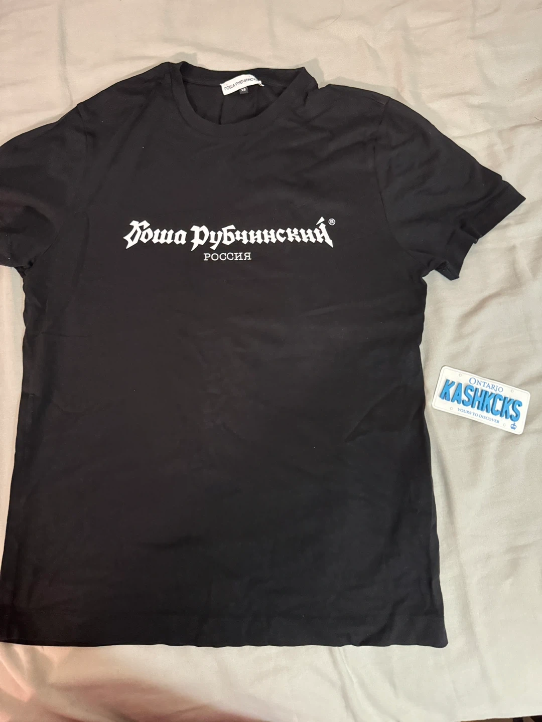 15Selling a black Gosha Rubchinskiy t-shirt. It's a size XS and in great condition. Features the brand's name in Cyrillic script across the chest.