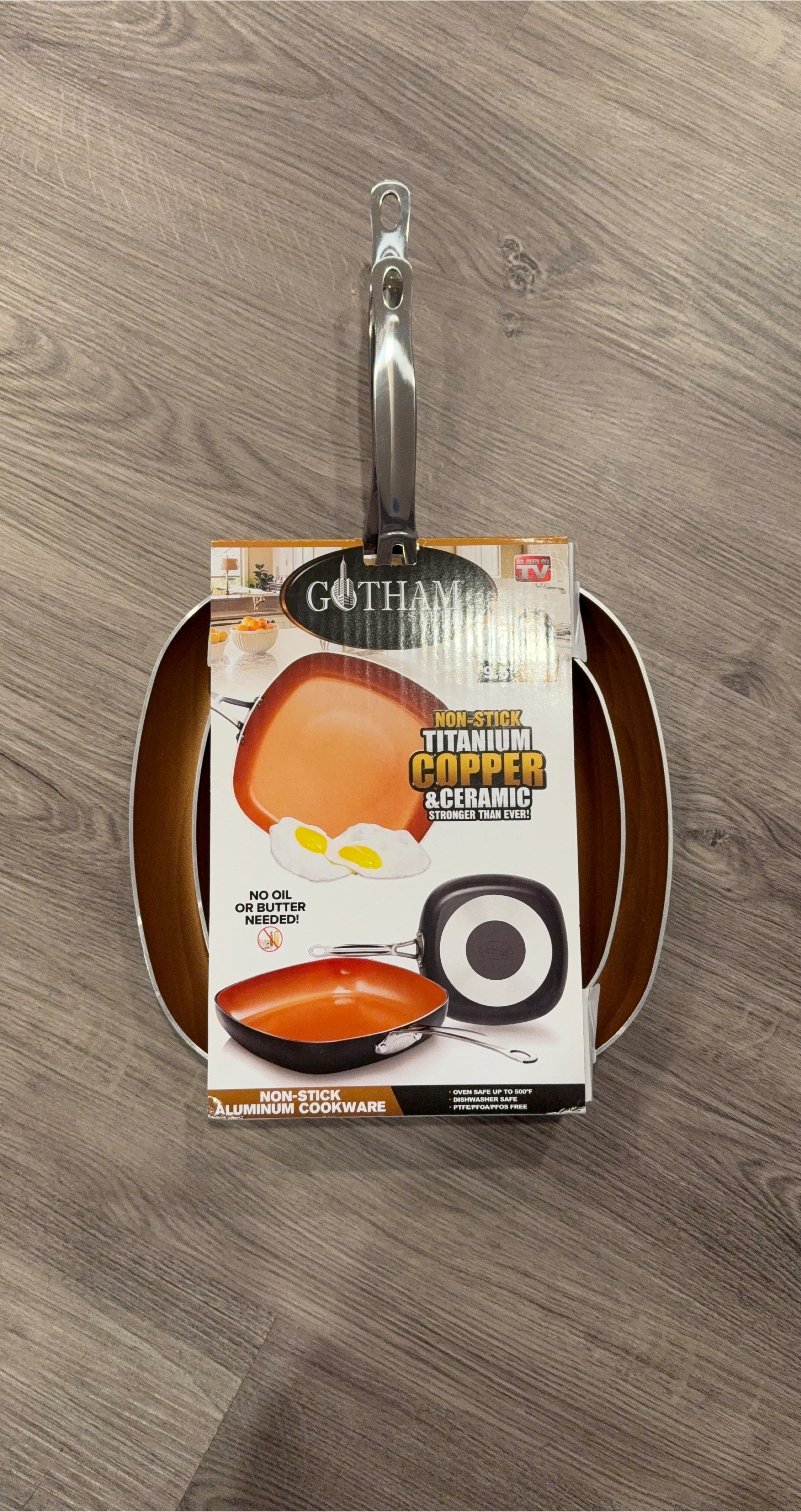 60Selling a brand new Gotham Steel fry pan! It's non-stick, made with titanium, copper, and ceramic for extra strength. You don't even need oil or butter. Plus, it's oven safe up to 500°F and dishwasher safe. It's also PTFE/PFOA/PFOS free!