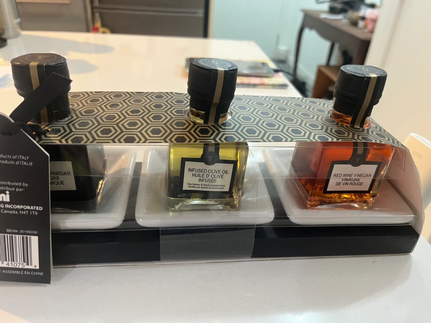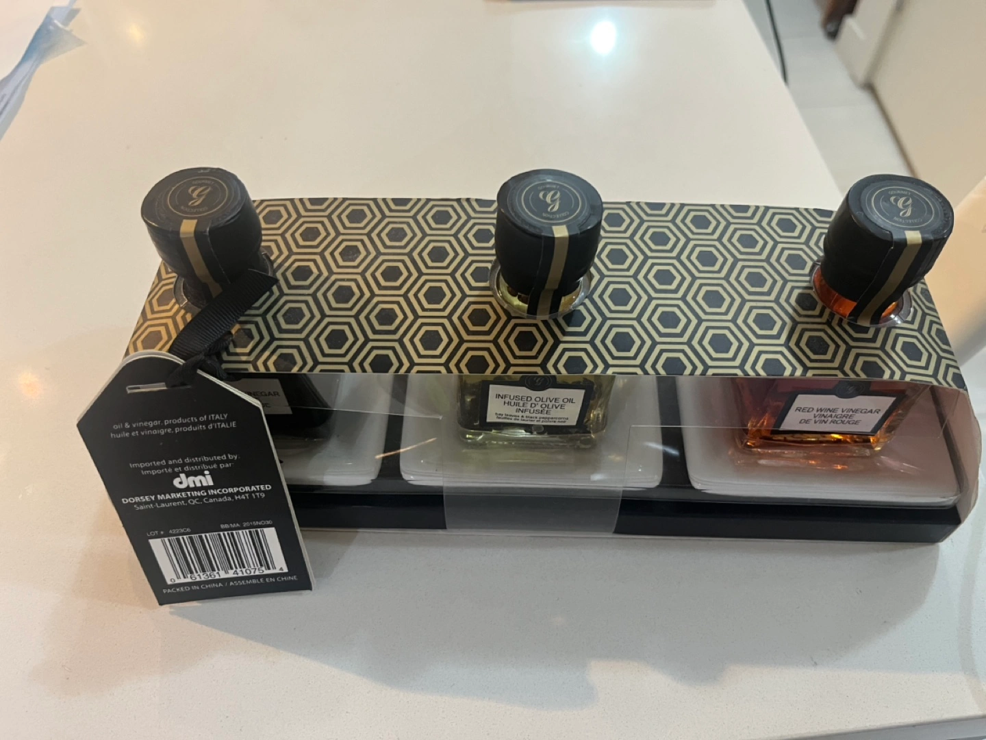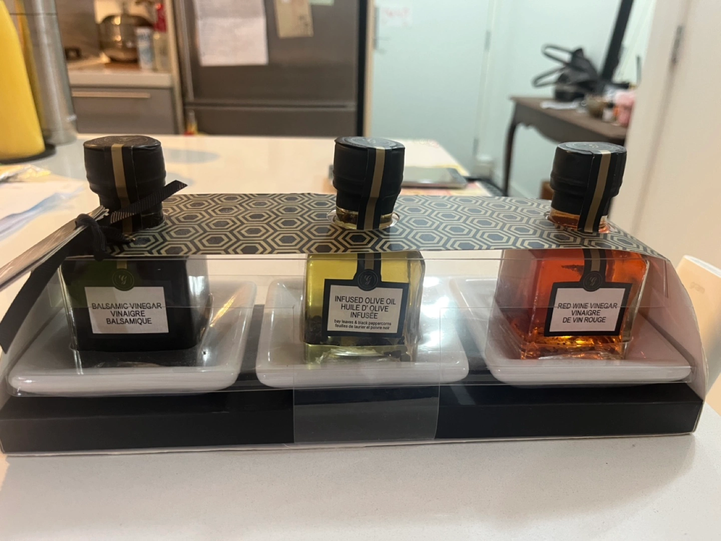 Three mini bottles: balsamic vinegar, infused olive oil, and red wine vinegar. Presented in an elegant black and gold gift box with small white dishes. Perfect gift for foodies!