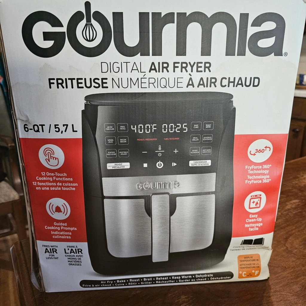 This is a used (only twice) Gourmia digital air fryer with a 6-QT / 5.7 L capacity, offering a convenient way to enjoy your favourite fried foods with less oil. It features 12 one-touch cooking functions, making it easy to air fry, bake, roast, and more. The FryForce 360° technology ensures even cooking, and the digital display offers guided cooking prompts for ease of use. Specifications: * Capacity: 6-QT / 5.7 L * 12 One-Touch Cooking Functions * FryForce 360° Technology * Digital Display with Cooking Prompts * Easy Clean-Up
