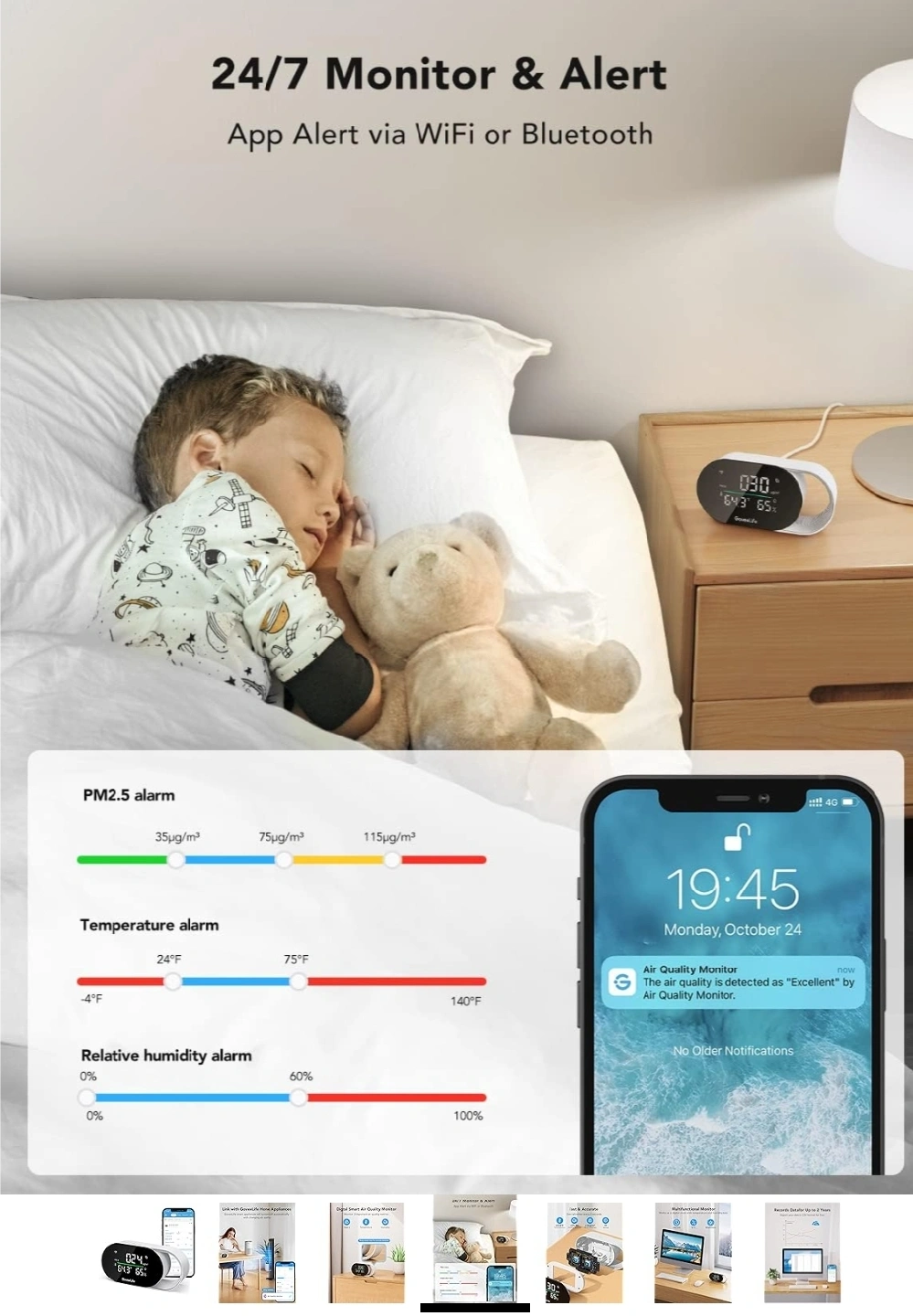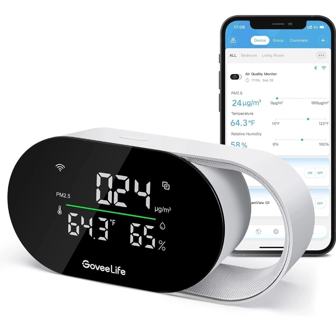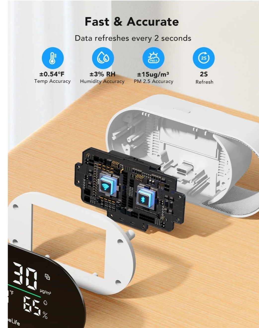 Keep track of your indoor air quality with this GoveeLife smart monitor! It measures PM2.5, temperature, and humidity, giving you a comprehensive view of your environment. The monitor also functions as a digital clock and displays temperature in both Celsius and Fahrenheit. It refreshes data every 2 seconds for fast and accurate readings
