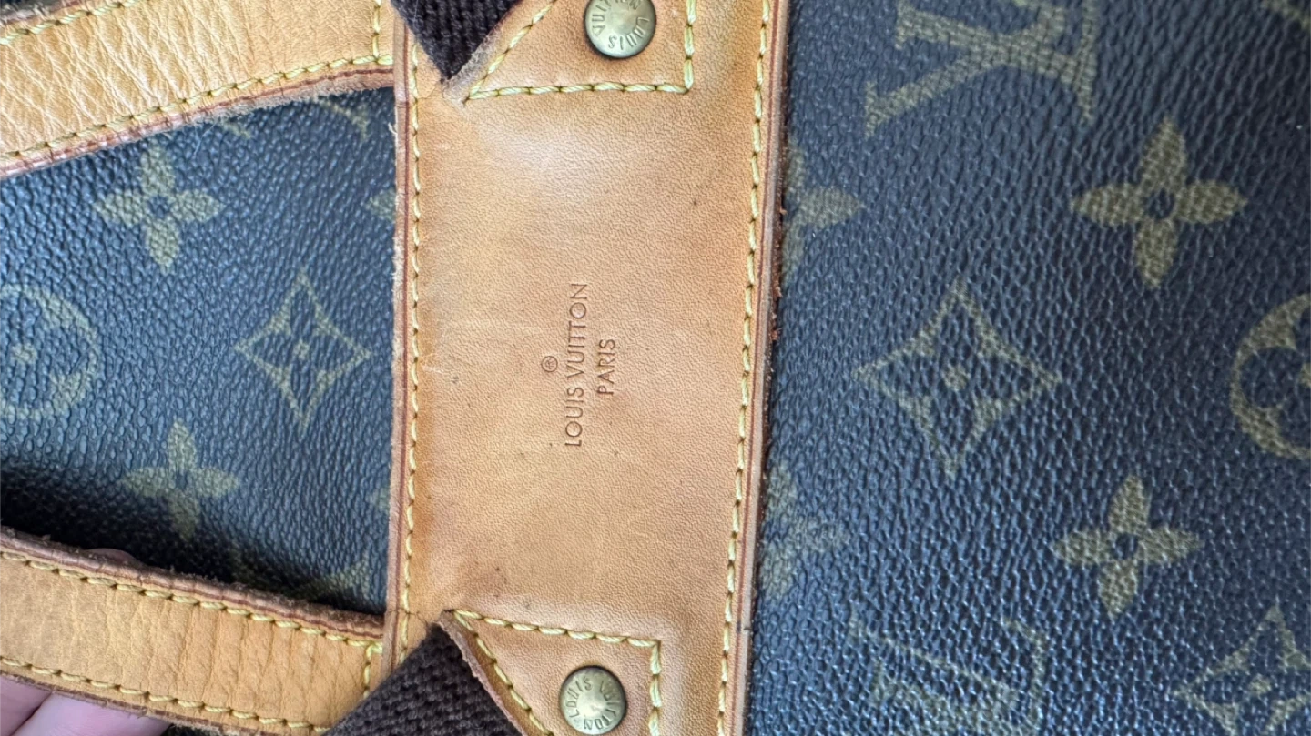missing the top drawstring and has a couple small interior spills which can be cleaned, plus normal wear on the leather trim from age. no rips or major damage at all.