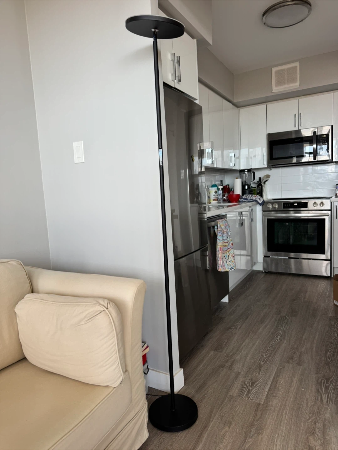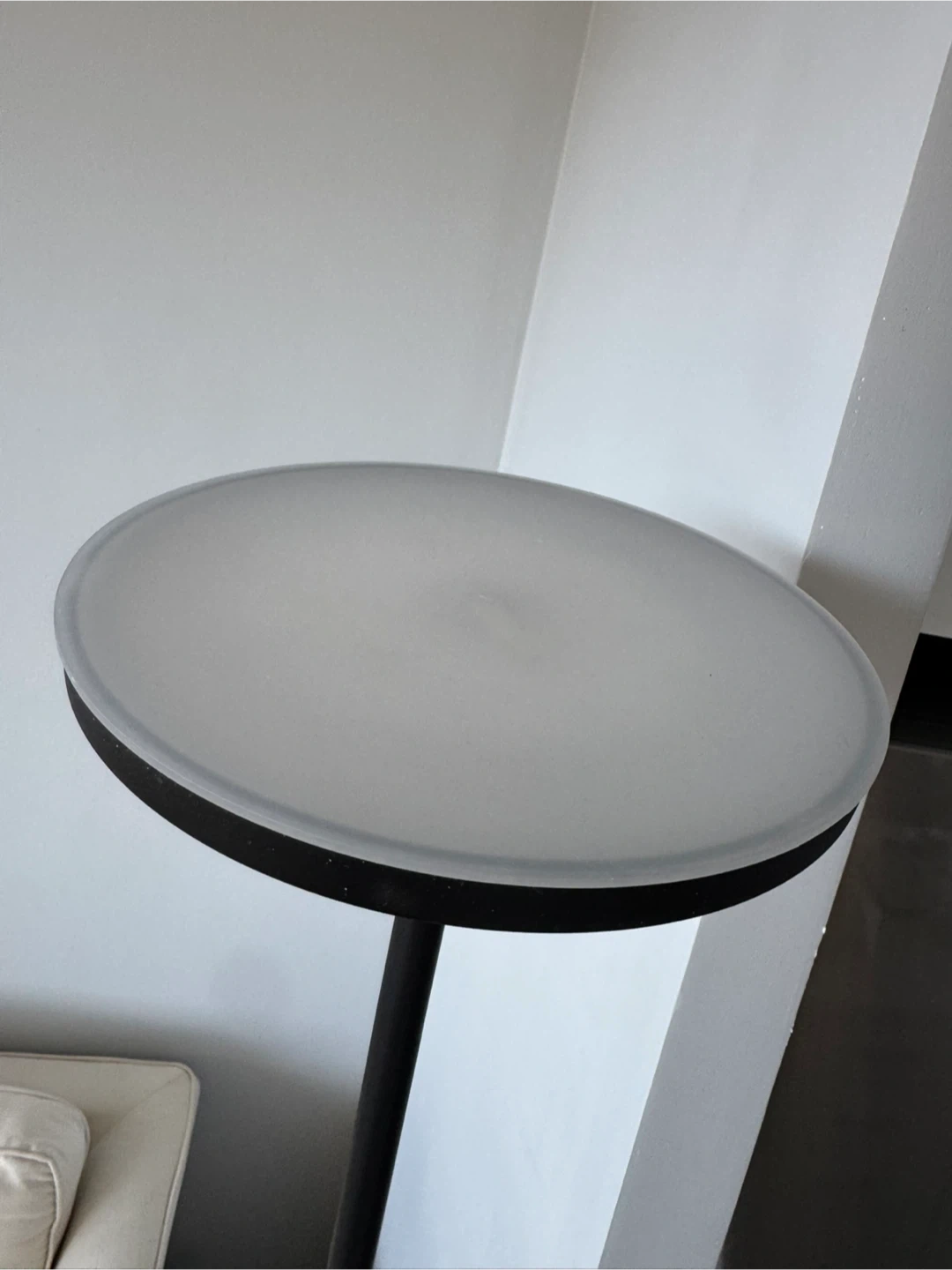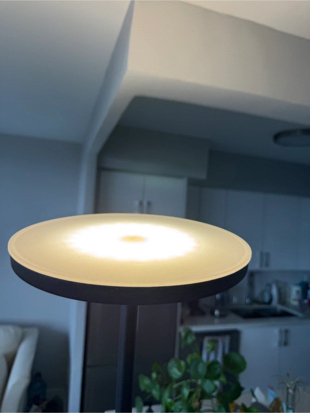 Sleek black floor lamp with a circular frosted shade. It features integrated touch controls for power, brightness adjustment, and mode selection. Provides adjustable ambient lighting for any room. Upward angle minimises glare.