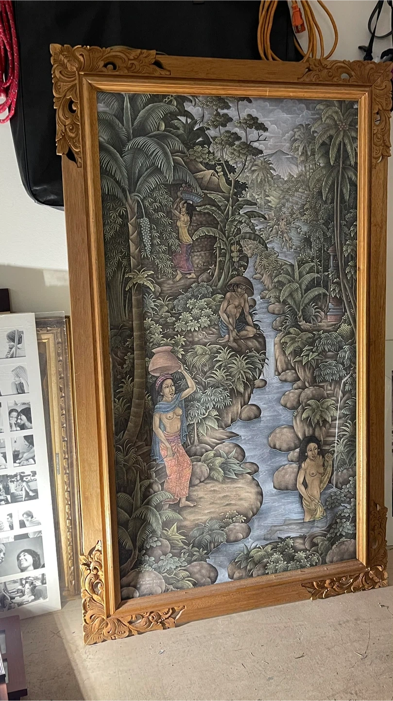 Beautiful Balinese painting in a carved wooden frame. The painting depicts a scene of people in a tropical landscape with a river. The frame is ornate and adds to the overall aesthetic of the piece. It's signed by I. Ketut Sadia, Rice Paddy Bengale, Ubud Bali