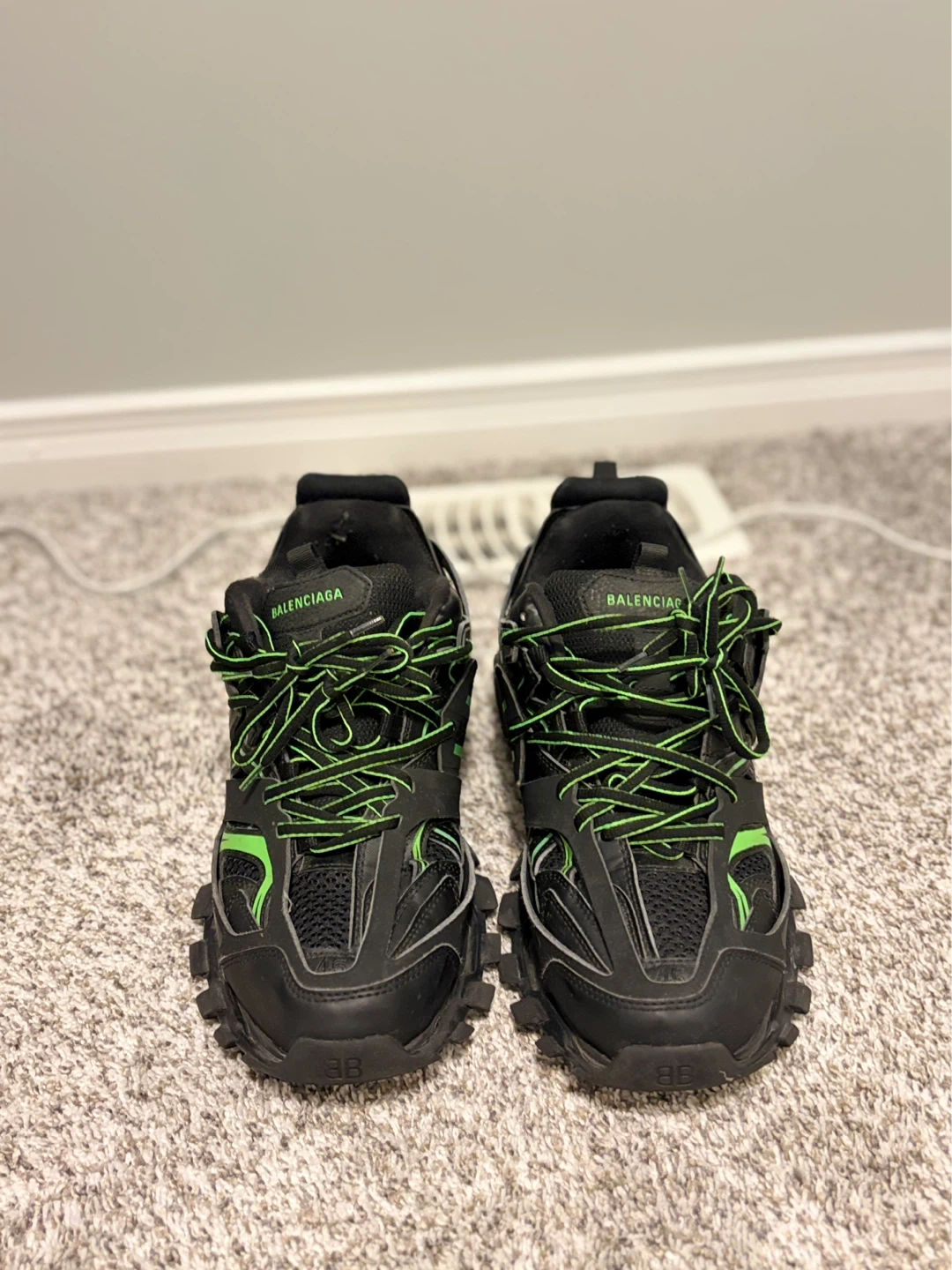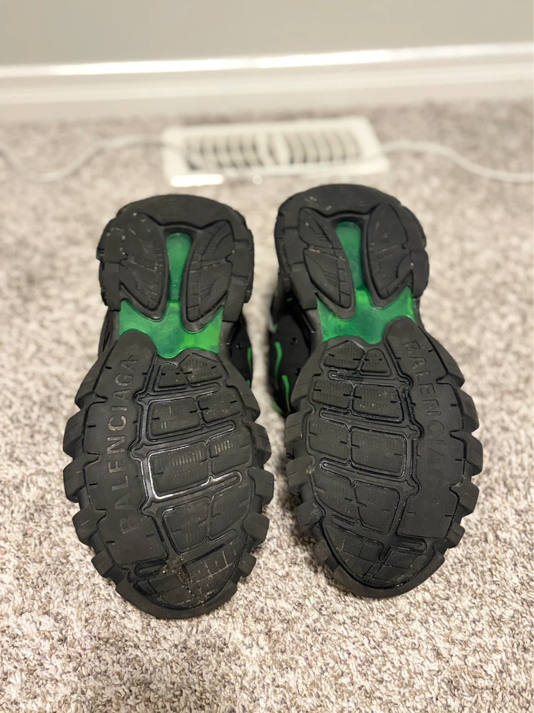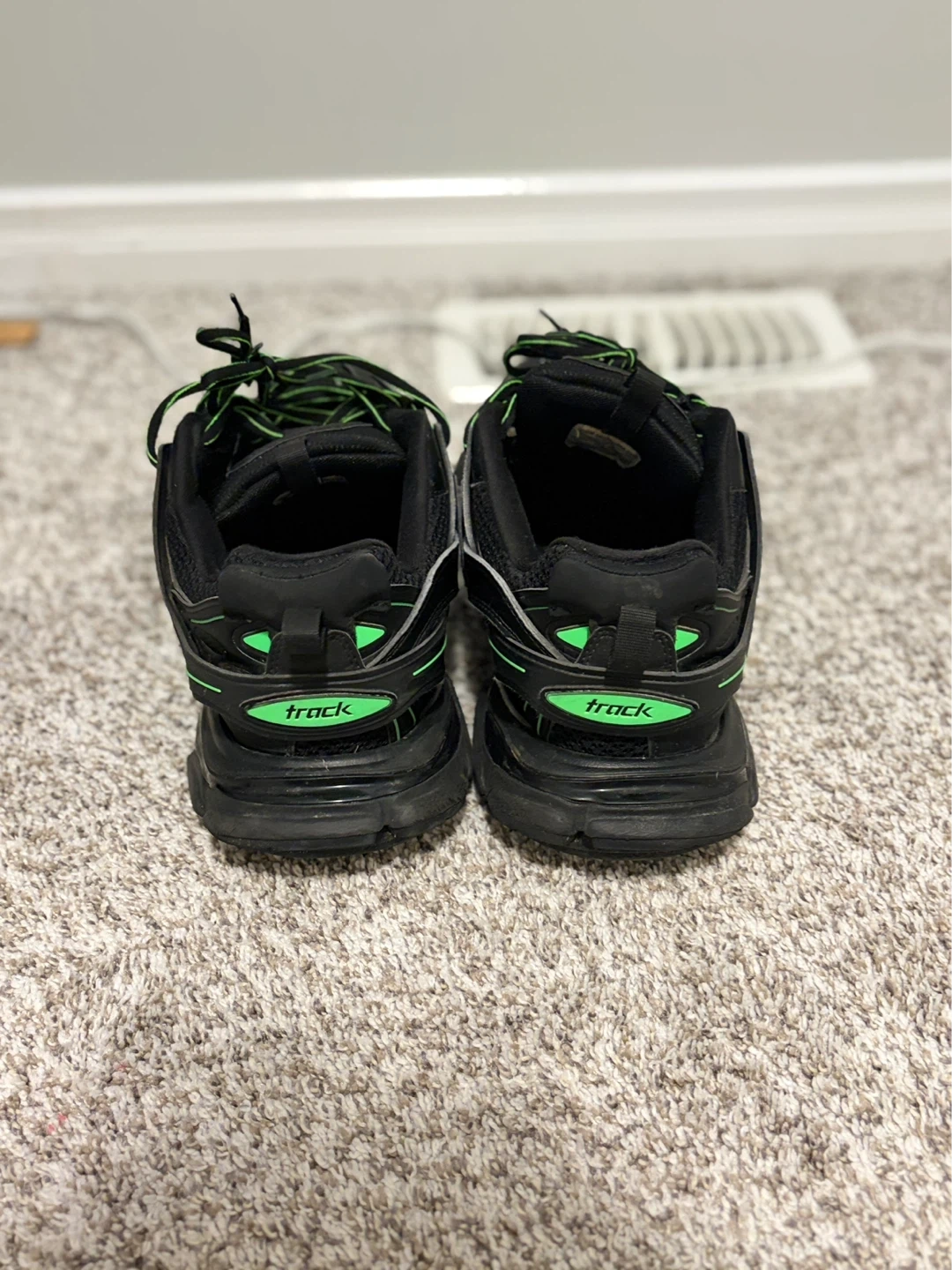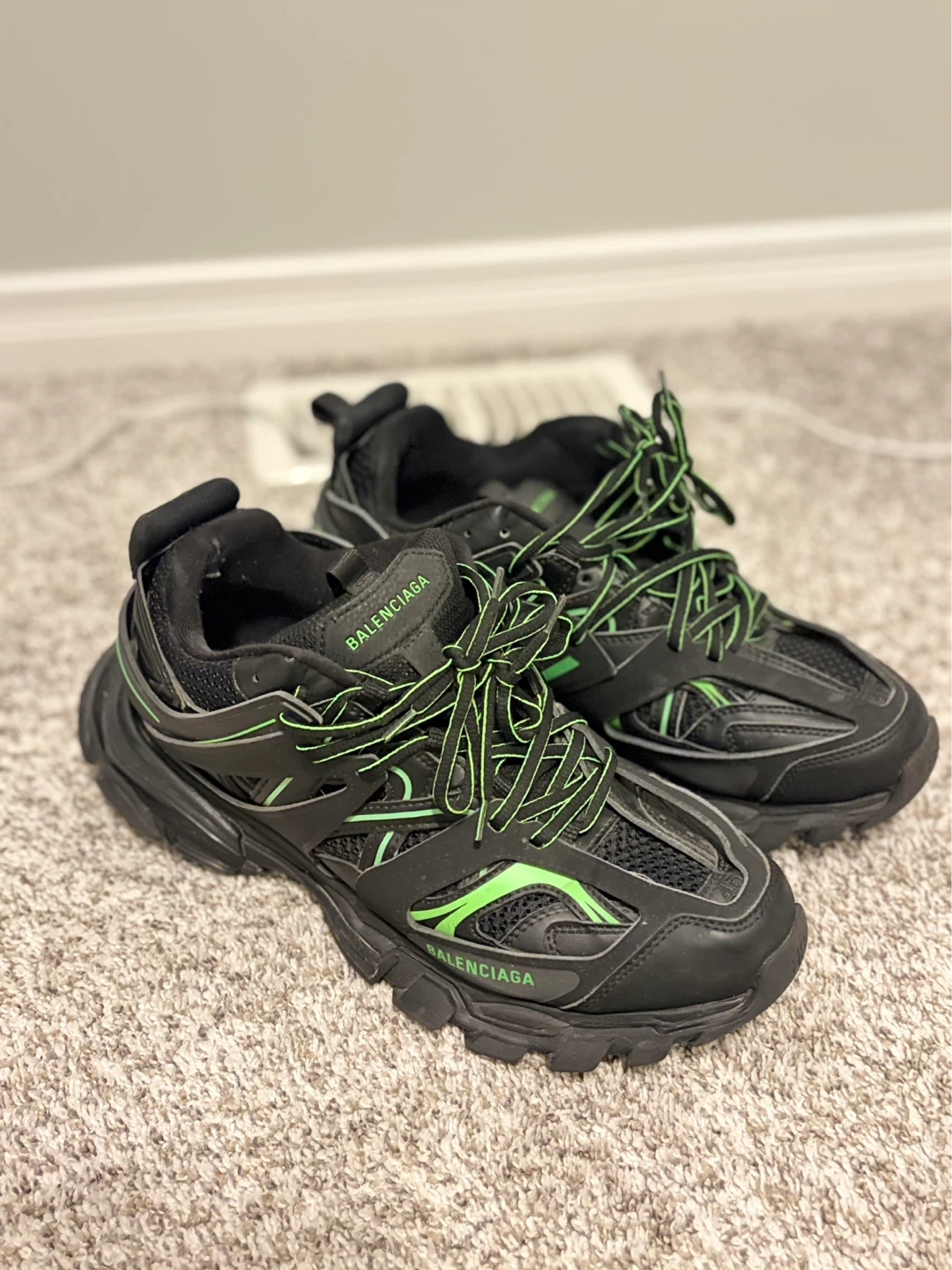 Balenciaga Track sneakers in black with neon green accents. These kicks are designed for comfort and style. Suitable for everyday wear or active pursuits!