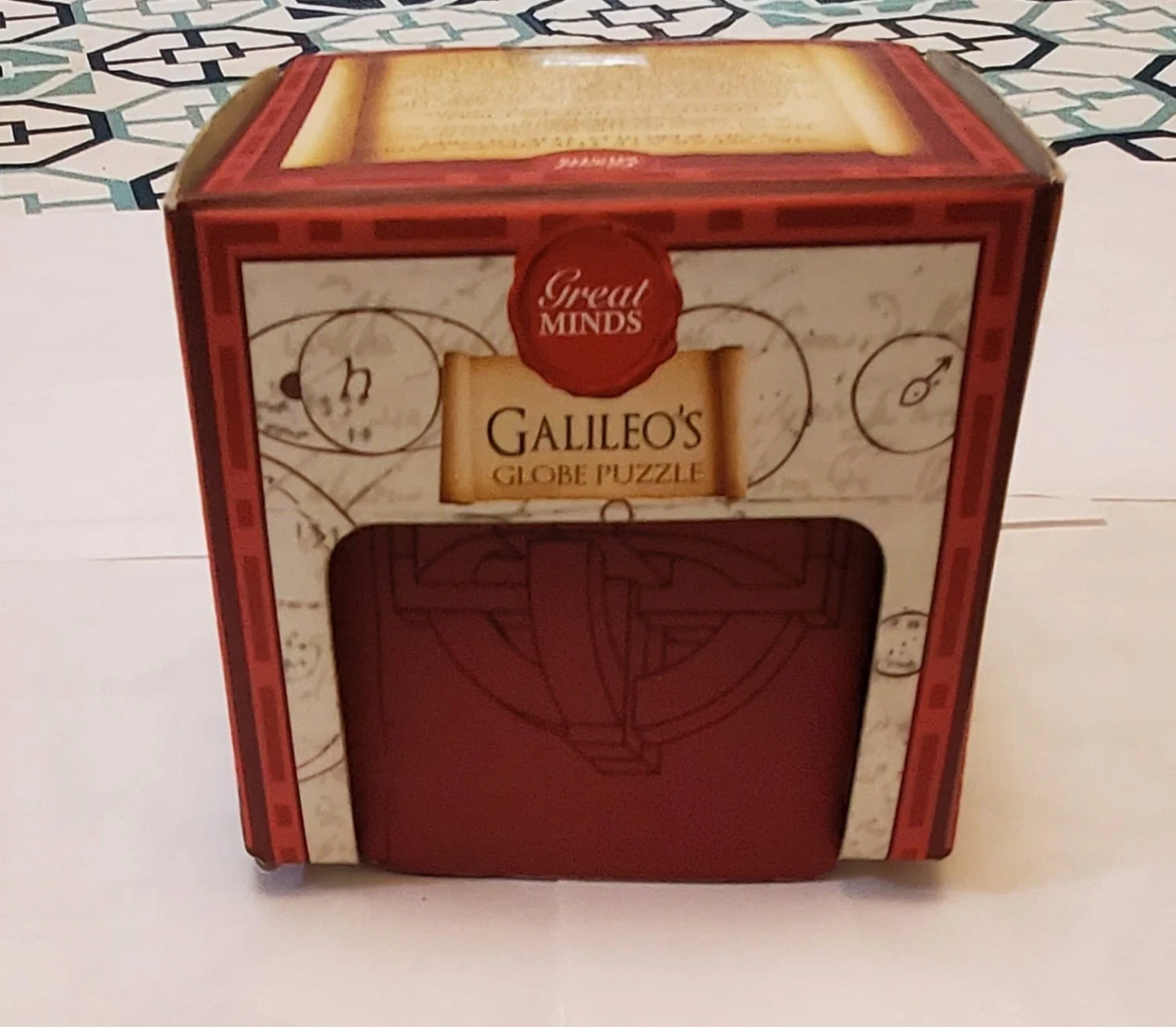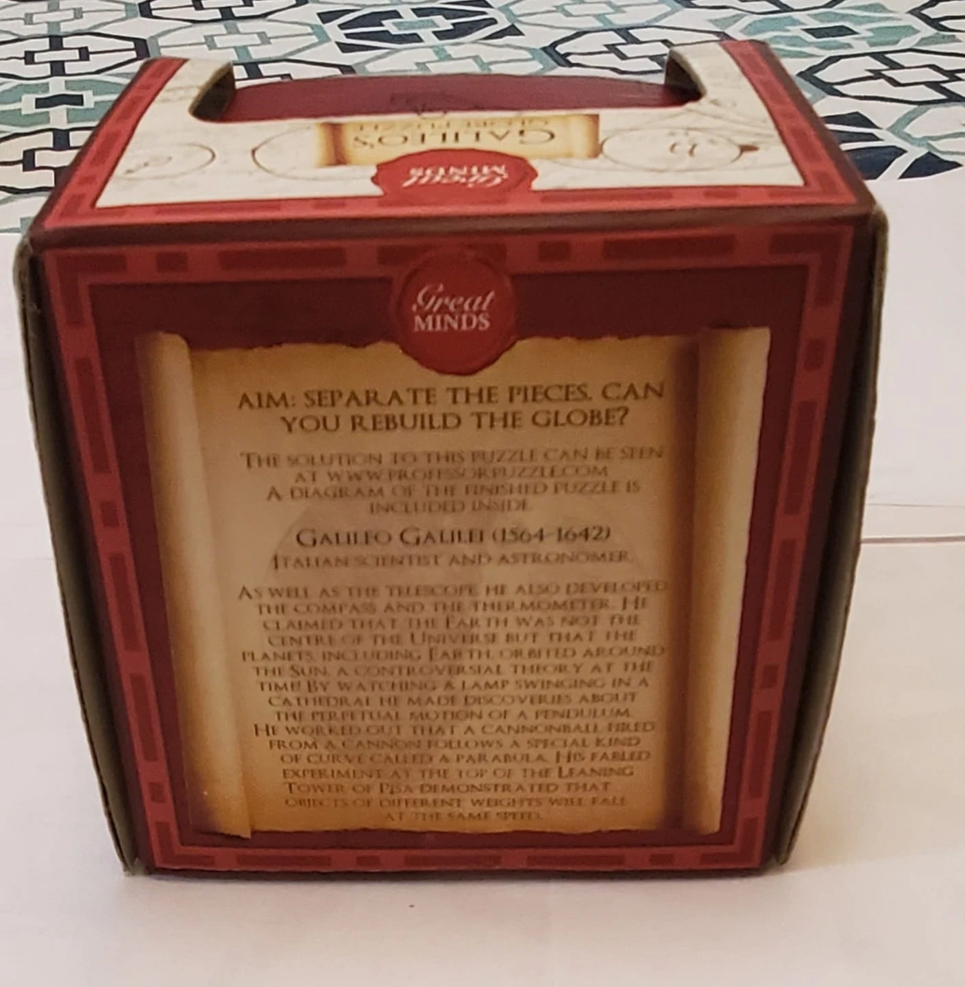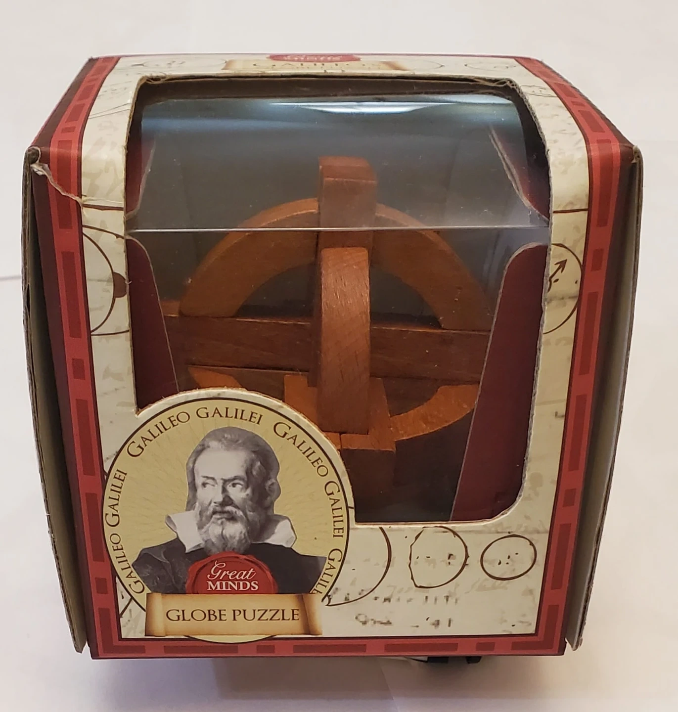 This is Galileo's Globe Puzzle from Great Minds. It's a wooden puzzle designed to be separated and rebuilt. The packaging includes information about Galileo Galilei and a website for solutions.