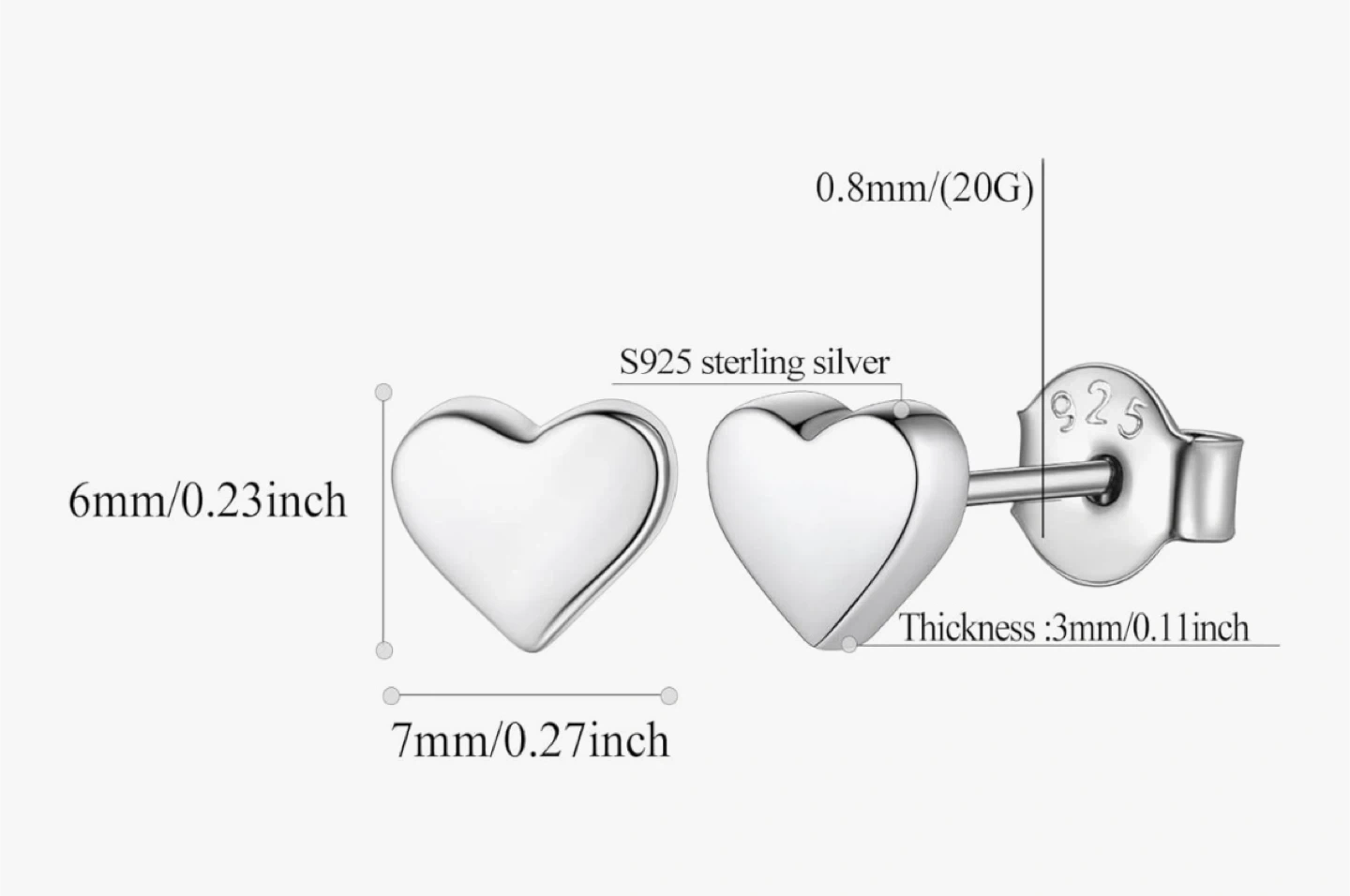 These S925 sterling silver stud earrings are shaped like small hearts. They measure 7mm/0.27inch wide and 6mm/0.23inch high, with a thickness of 3mm/0.11inch. The post is 0.8mm (20G). Includes original box and pouch.
