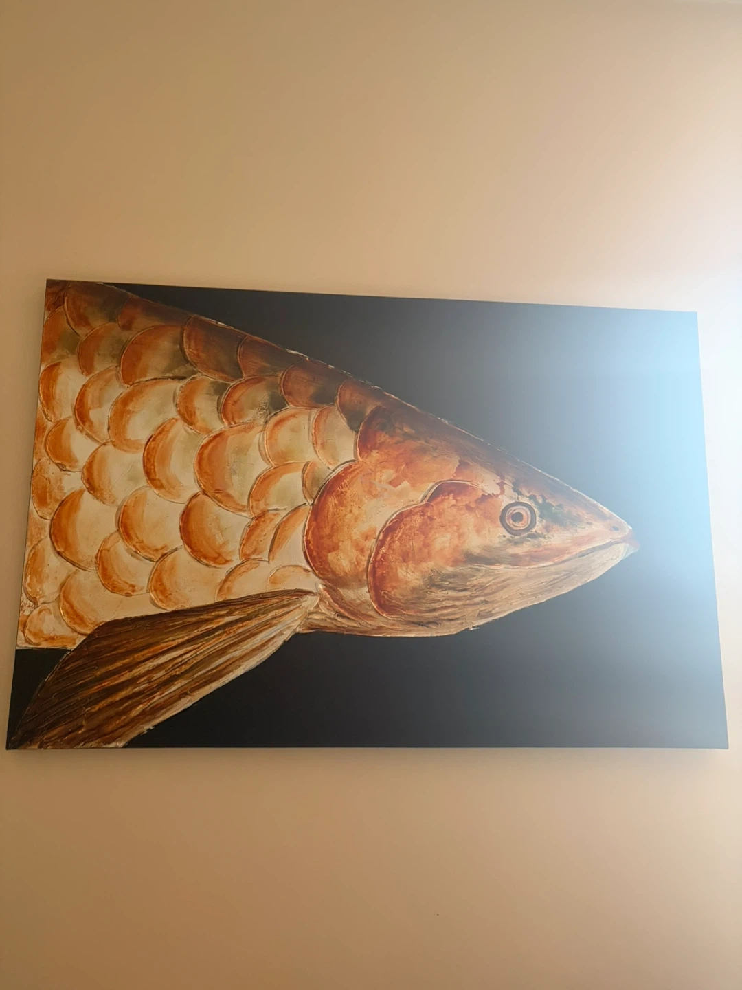 This is a canvas painting featuring a detailed illustration of an Arowana fish. The art displays a warm, metallic sheen on its scales against a dark background. It's a striking piece that'll add a touch of elegance to any room.
