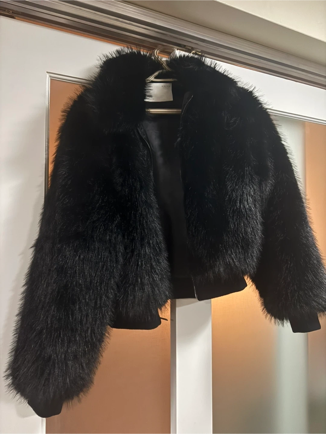 Cozy up in this Oak + Fort faux fur bomber jacket! It's a size XS and features a stylish, cropped silhouette. Perfect for adding a touch of glam to any outfit
