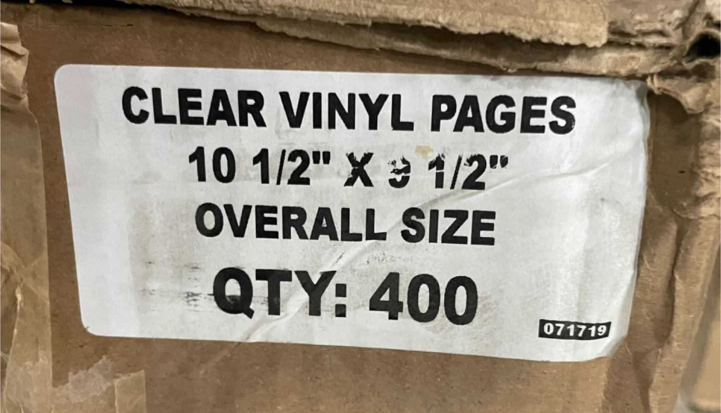 $20 per box Clear Vinyl Pages 10.5" x 9.5" - QTY 400