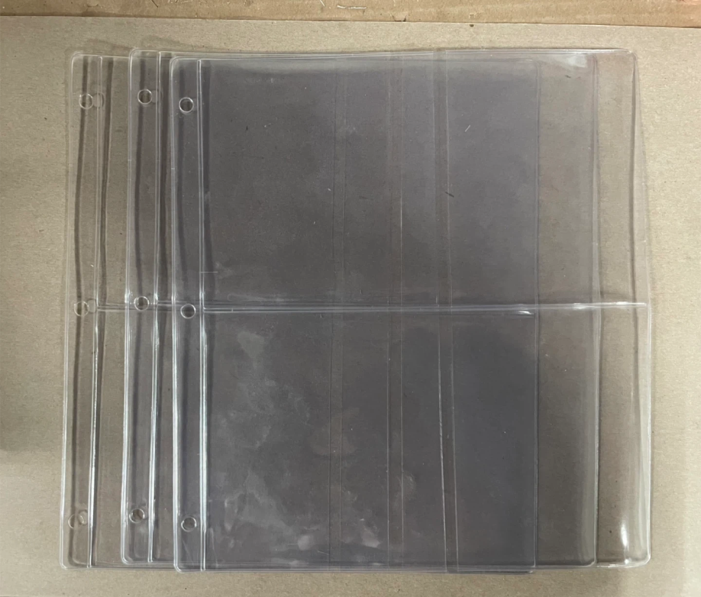These are clear vinyl pages with an overall size of 10 1/2" x 9 1/2". You'll get a quantity of 400 pages. They're great for organizing and protecting your documents or collectibles. The pages feature a three-hole punch on the side for easy insertion into binders.