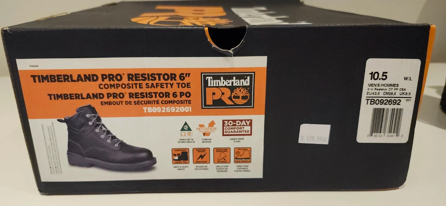Brand new Timberland PRO Resistor 6" Composite Safety Toe work boots. Black leather construction. Includes original box. Size 10.5 W/L.