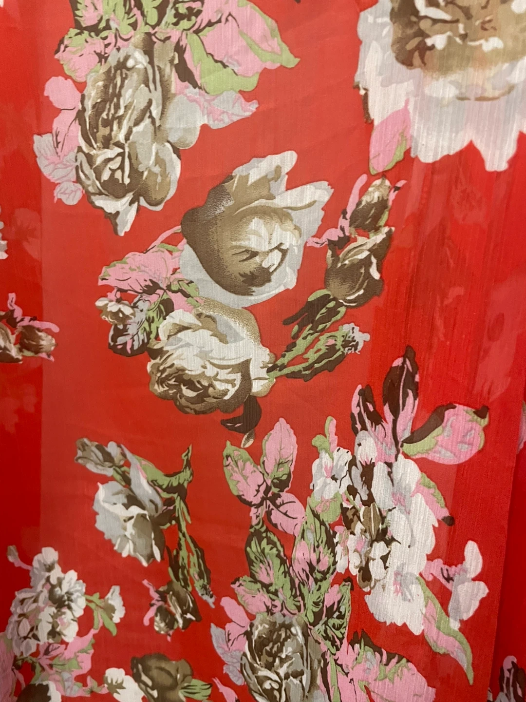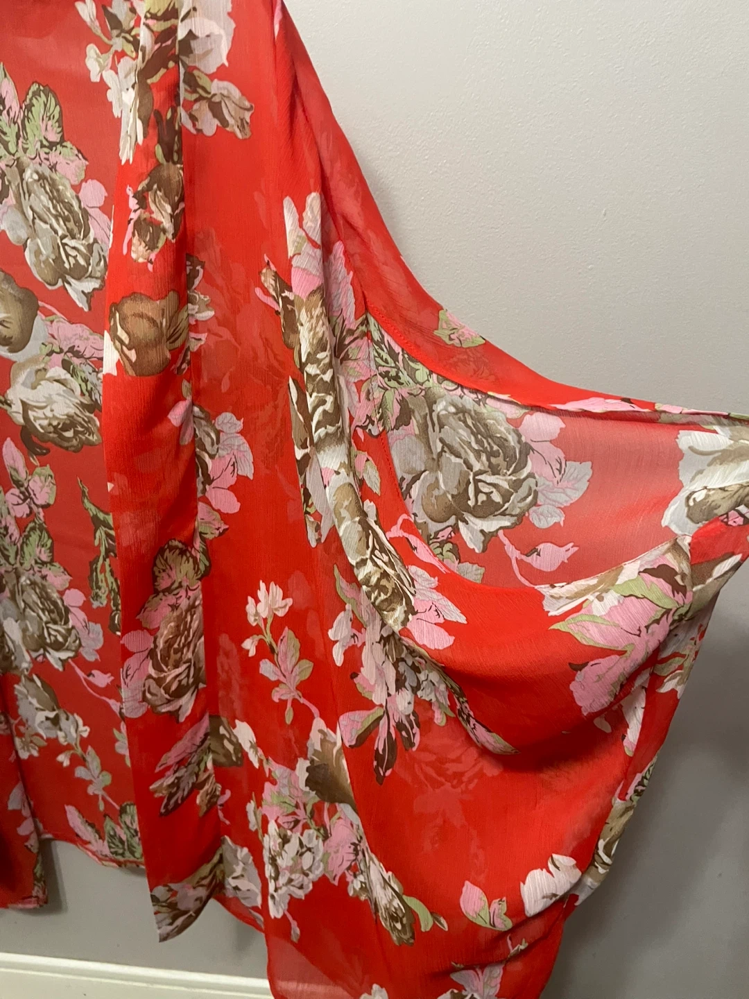 This is a lightweight kimono cardigan with a vibrant red floral print. It's made of sheer chiffon fabric and drapes open at the front. Its flowy design makes it a lovely layering piece.