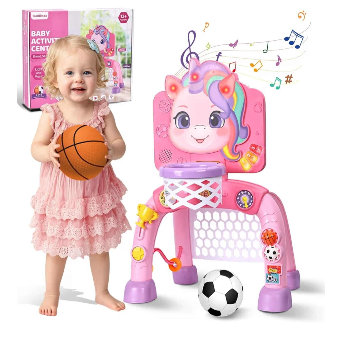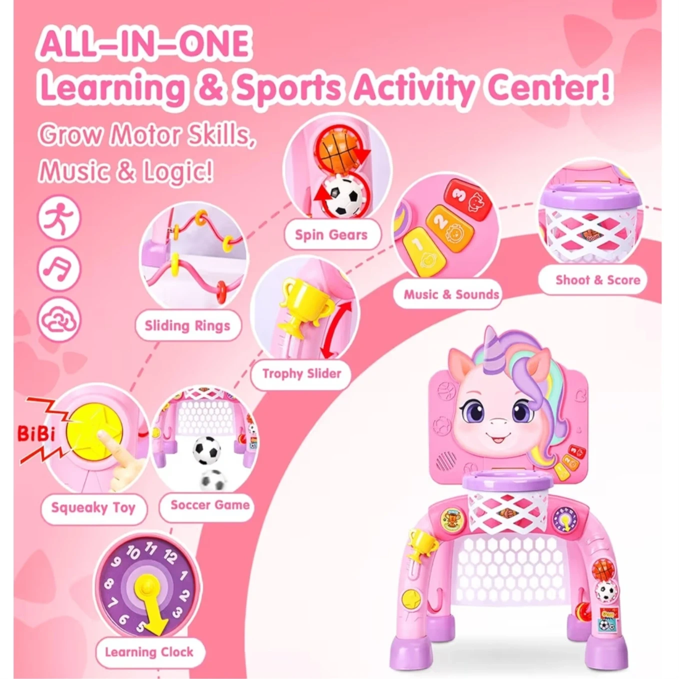 This pink unicorn activity center is designed for babies aged 12 months and up. It features a basketball hoop, soccer goal, and a learning clock. It also includes music and sounds, sliding rings, spin gears, a trophy slider, and a squeaky toy. It's a 2-in-1 learning and sports activity centre that helps grow motor skills, music and logic!