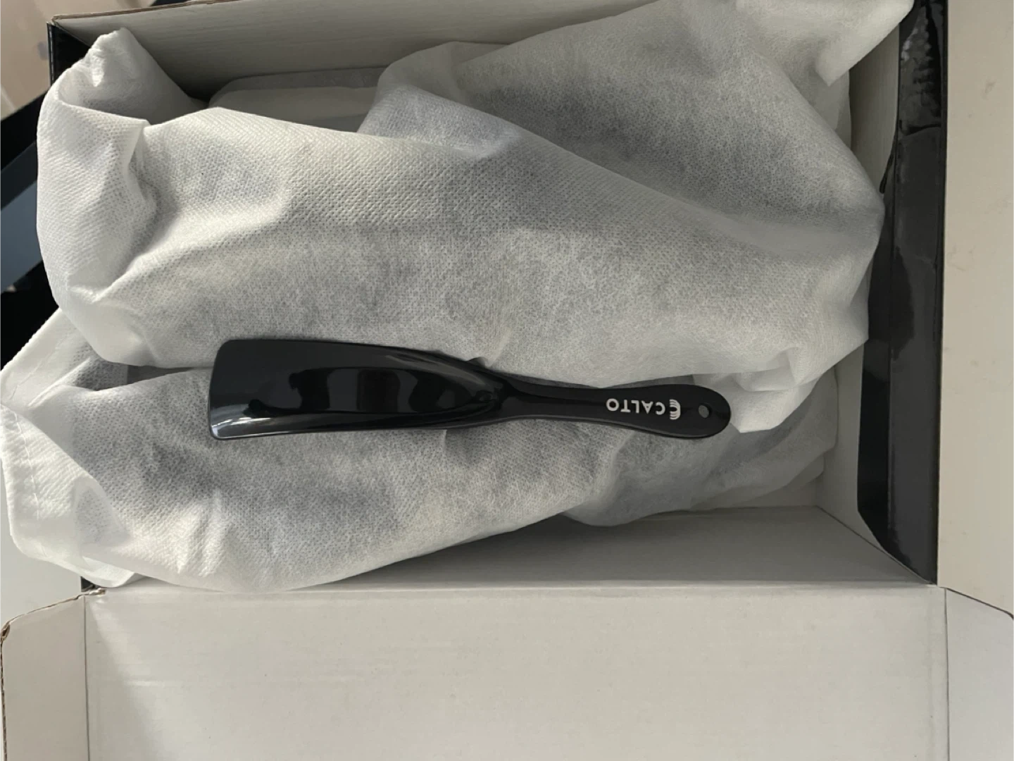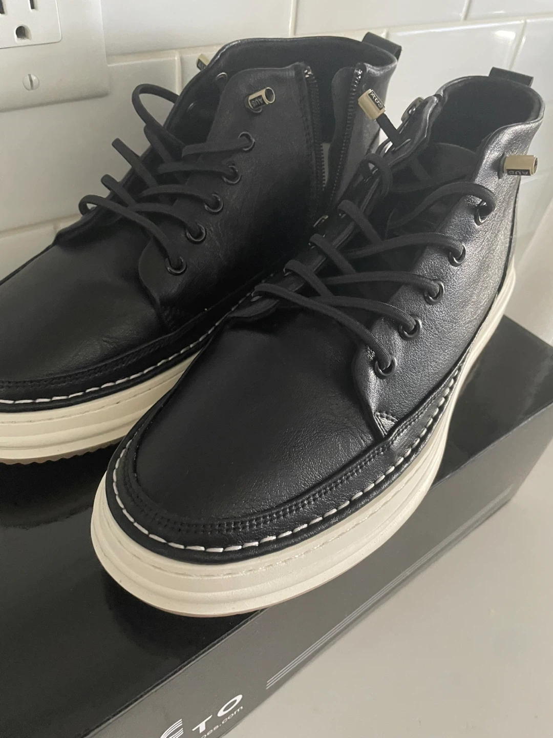 These are black leather high-top boots from CALTO. They feature a side zipper and lace-up closure. Includes a shoehorn and original box. Never worn. Brand new!