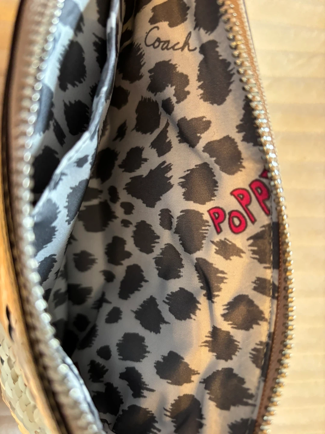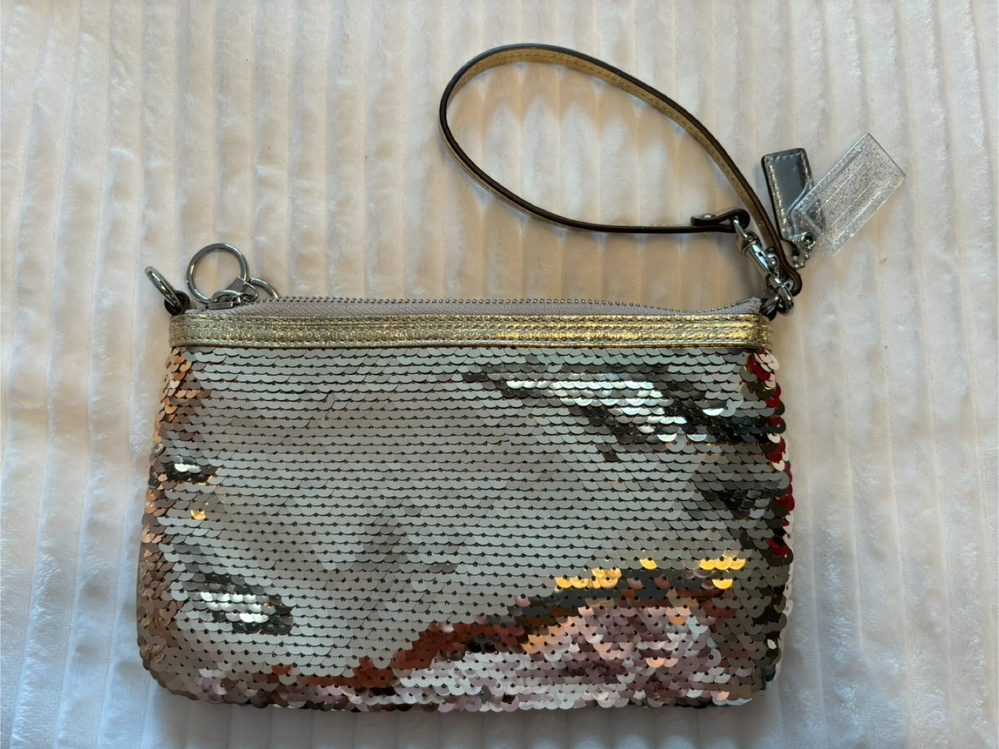 This Coach Poppy wristlet clutch is covered in reversible sequins. It features a leopard print interior and a convenient wrist strap. Great for carrying essentials on the go!