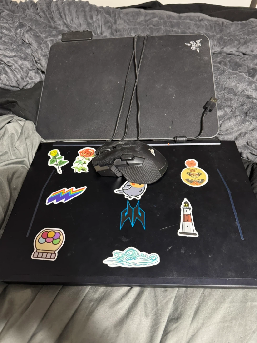 Acer Predator Helios 300 with razor rbg mouse pad and corsair mouse, the laptop makes a bit of noise but otherwise works great!