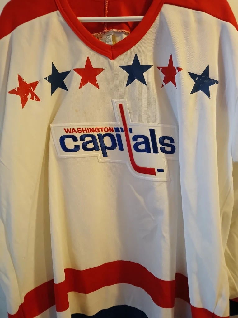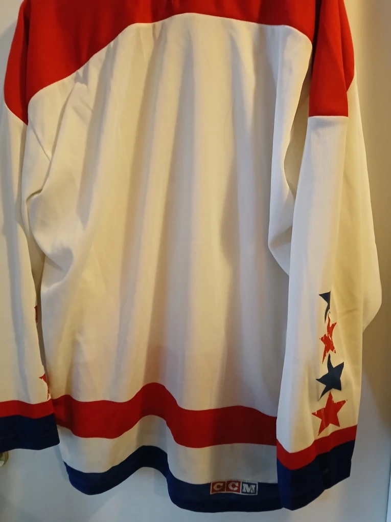 This is a CCM Washington Capitals hockey jersey. It's made of 100% polyester and is size TG/XL. The jersey features the team's classic logo and star design. Has been well worn with love.