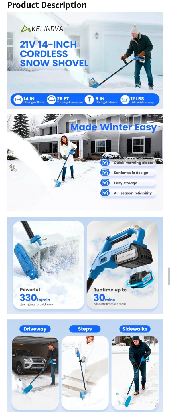 Make snow removal a breeze with this KELINOVA 21V 14-inch cordless electric snow shovel, featuring a 4.0Ah battery, directional plate, and a 26ft throwing distance. This snow shovel is in great condition, ready to tackle your patio, driveway, steps, and walkways.