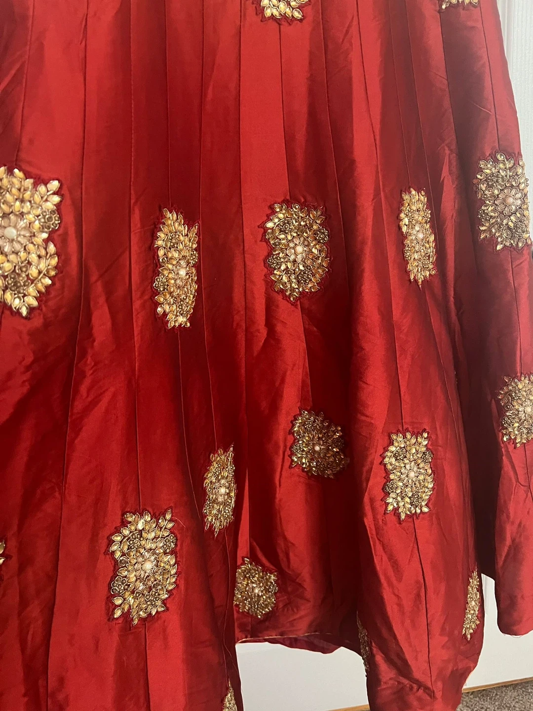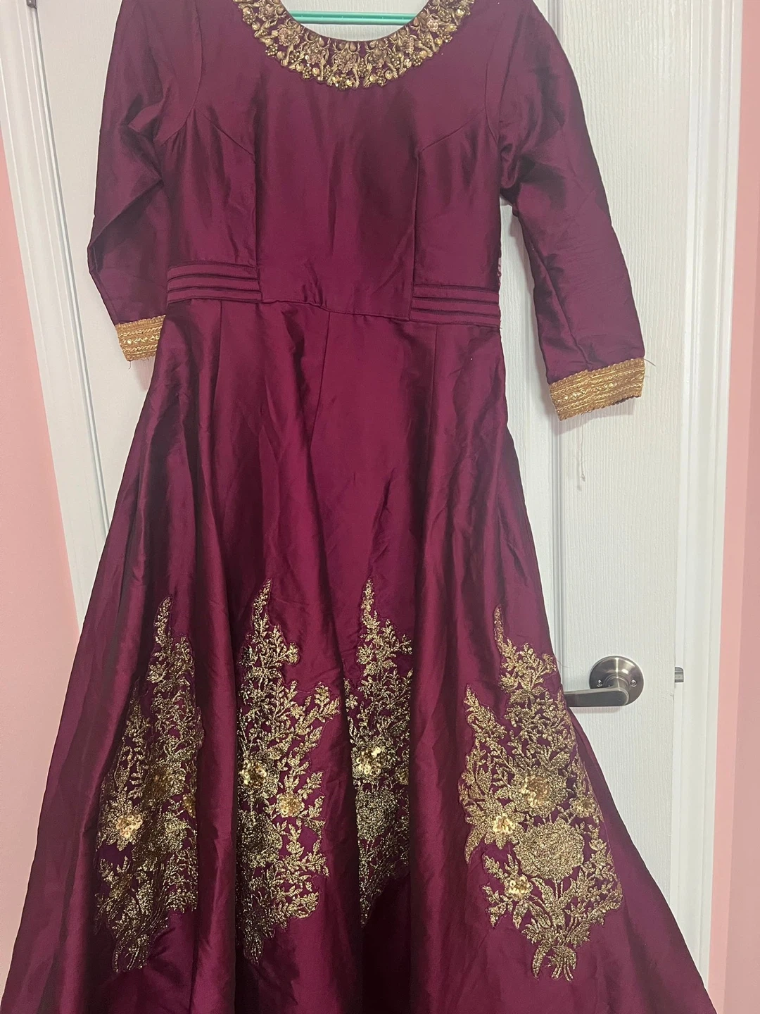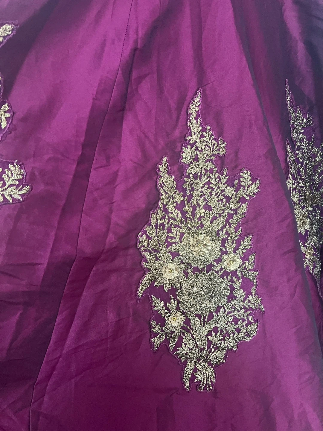 Gorgeous embroidered silk dresses in vibrant red and deep purple. Perfect for special occasions. Each dress features intricate gold thread work and embellishments.