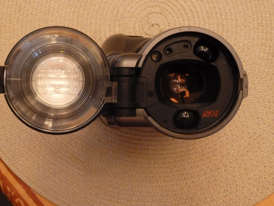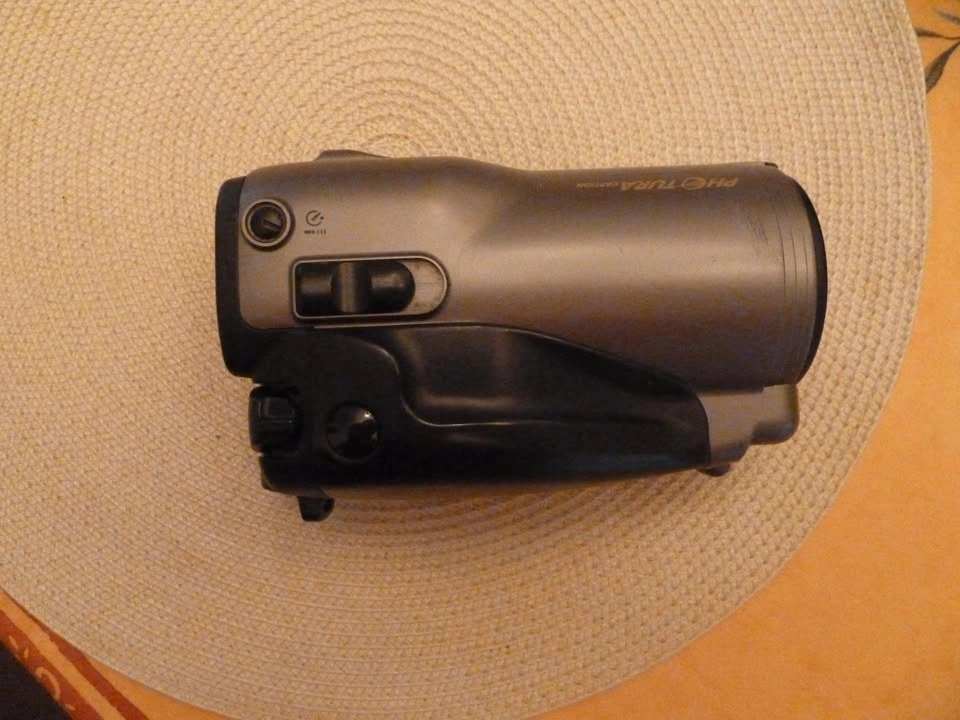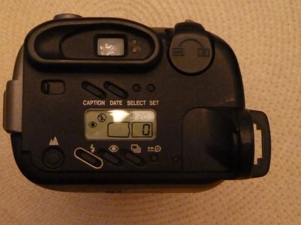 Feature-rich point and shoot 35mm camera shaped like a video camera so the long optical zoom remains enclosed. Easy to handle. All the controls are right in front of you. 35 - 105mm zoom 1:2.8 to 1:6.6 exposure rating. The flash moves in relation to the zoom! Adjust the view to match your prescription. There is even a little top view finder in case it is on a low tripod. Technically it is not an SLR because the viewfinder is in parallel to the lens. Barely used. It was my dad's last film camera. You'll need a battery. I don't think this one is rechargeable.