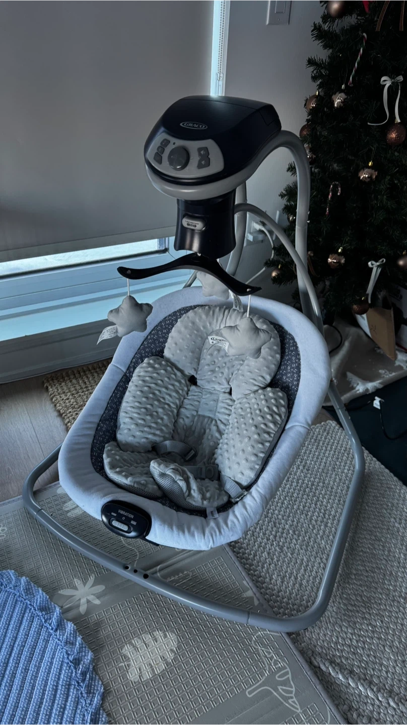 A Graco baby swing in a grey and white pattern. It's designed to soothe and entertain your little one. The swing has multiple speed settings and plays music. Newborn insert NOT included