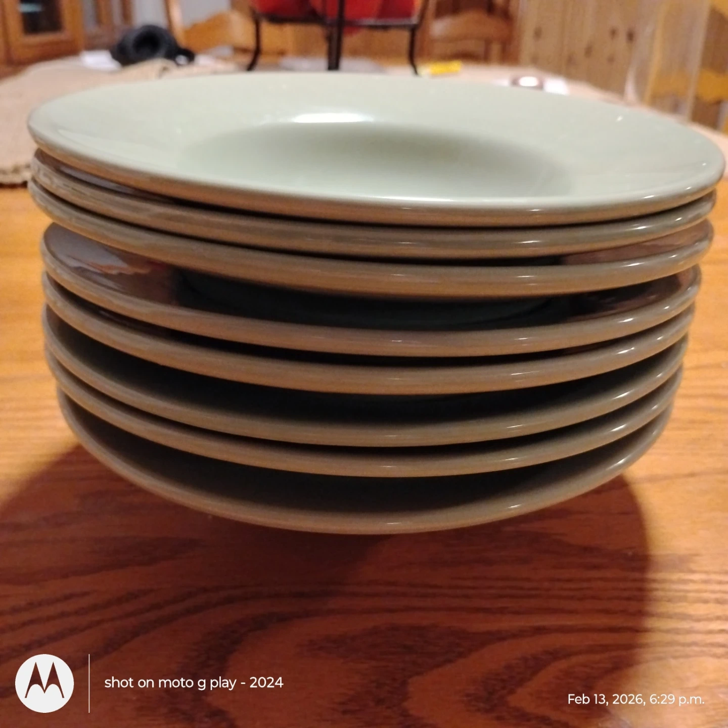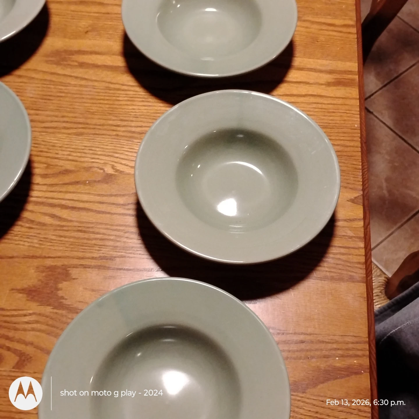 Set of 8 soup bowls in a light green colour. These are shallow bowls with a wide rim, perfect for pasta or soup. Made of ceramic and manufactured in China.